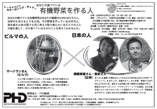 あなたの食べている有機野菜はあなたの健康のためにはもちろん、地球のためにもとても大切。その野菜を作っている日本の人、海を越えた他の国でも同じ考えで取り組んでいるビルマの人との話を通して、日々食べているもののことを考えてみませんか。
