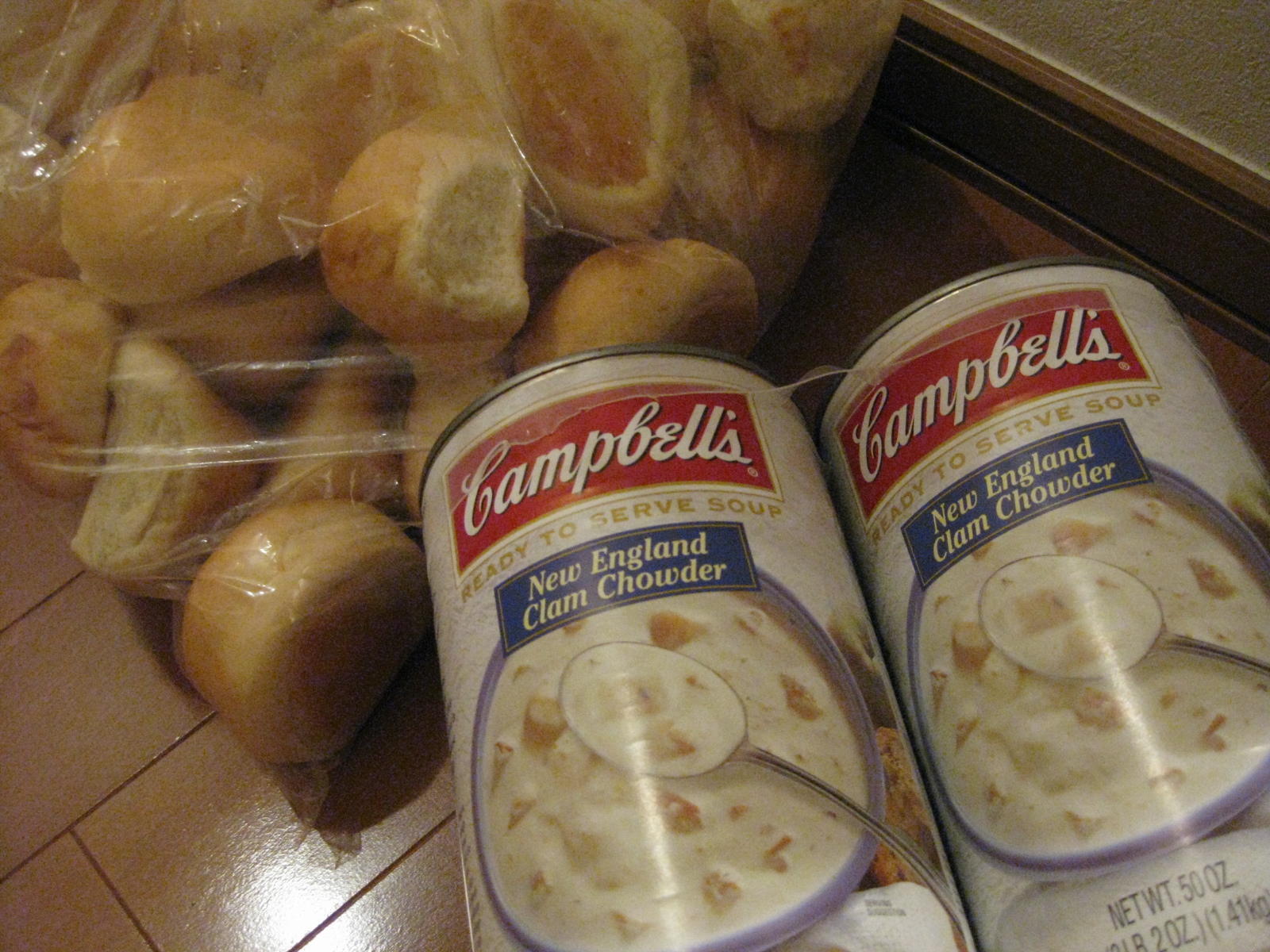 コストコのクラムチャウダーとディナーロールの組み合わせで
