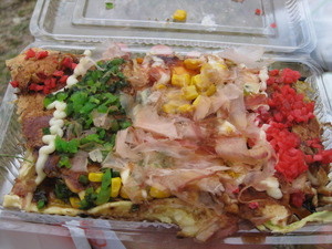 つまみにカラフルなお好み焼き・・・お新香のせいだな。