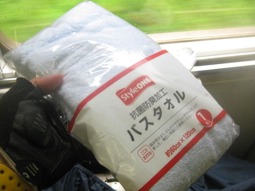 レーパンはそのままなのでコンビニで買ったバスタオルで体を拭いて