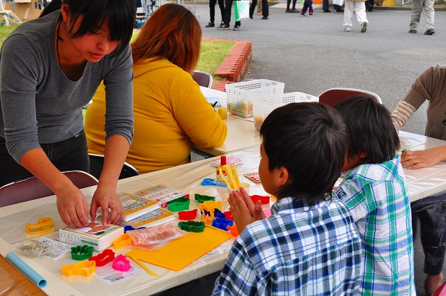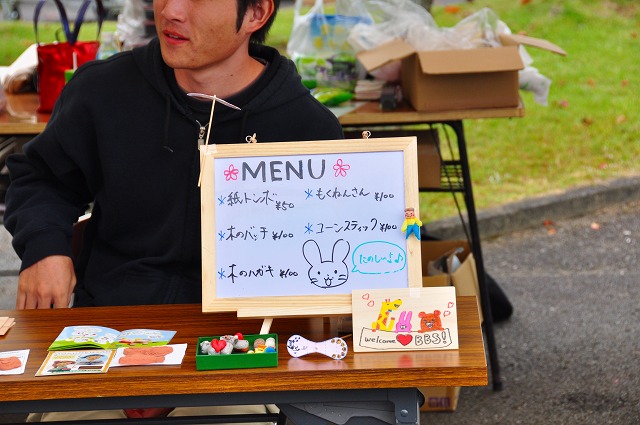 「工作教室」では、木のバッチ・木のねんど・木のはがき・紙トンボ・コーンスティックを子どもたちに作ってもらいました。