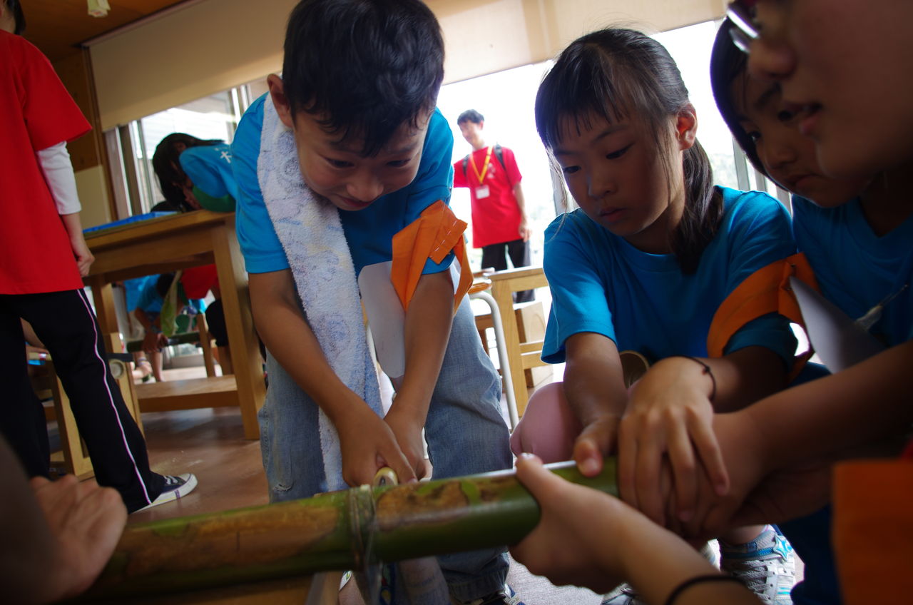 4、キャッチザスティック(一人1本スティックを持ち、横一列に並びリズム良く、自分のスティックを離し、隣のスティックを掴むゲーム。連続何回できるかで競う。)
