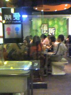 座席は便器、テーブルは便所にある排水用の容器にガラス板を置いたもの、テーブルを拭くものなどは、トイレットペーパーが置いてあったりだとか。。。