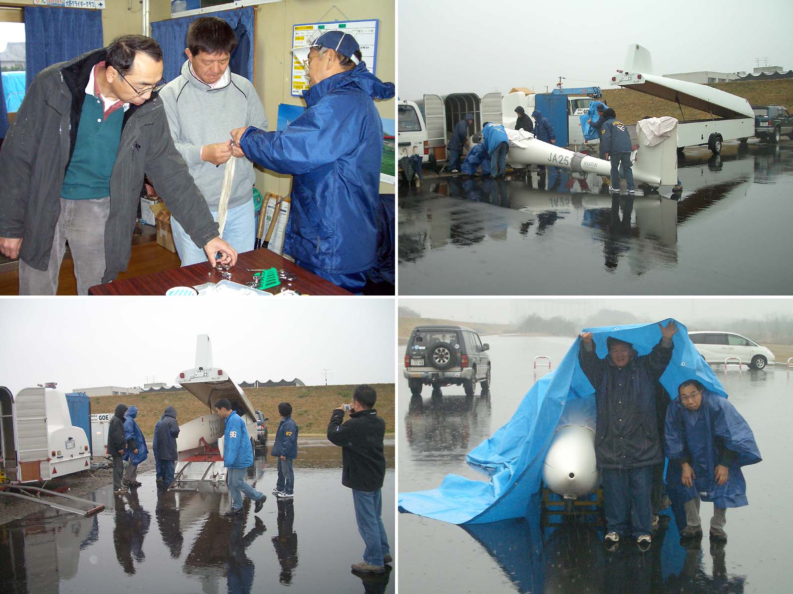 ミカエル(ASK-23)を取に来た南山大学の学生さんと磯谷教官、積込み途中で大粒の雨の洗礼を受けましたが無事終了。明日からの機体展示、新入部員を多く獲得できると良いですね。