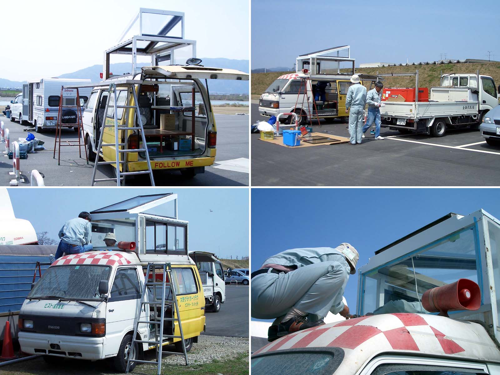 06.0409 ピストカー改修中 堤防の桜が満開の大野、その満開の桜をバックにグライダーを撮るアマチュア写真家も居ました。