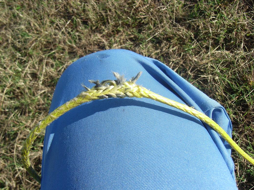 索の傷みができました。10/13に 一時 隣の鋼索を引きずっての曳航があり、半分ほど切れたストランドが 2本あります。写真のように切れた糸は 毛羽立ち
