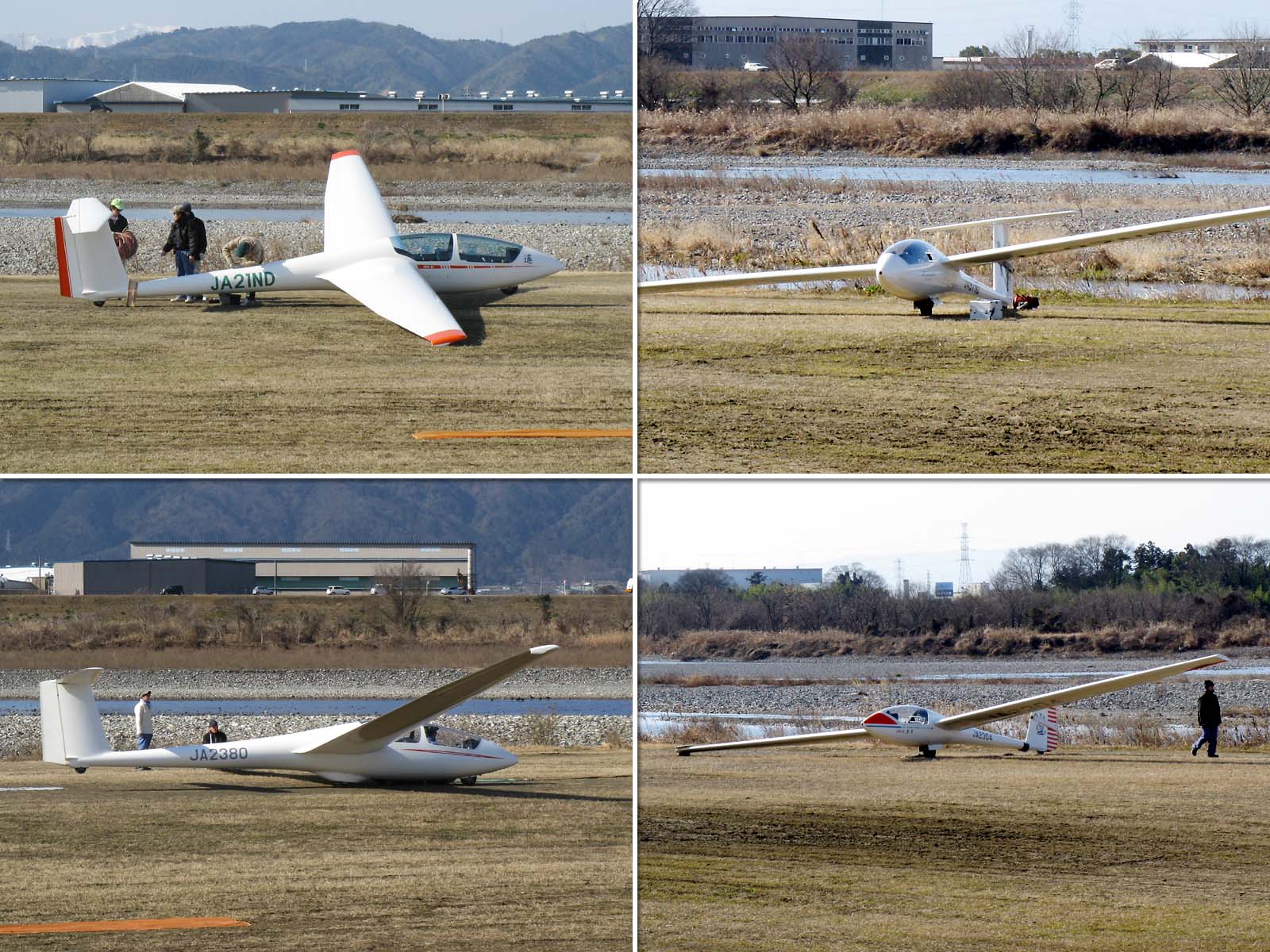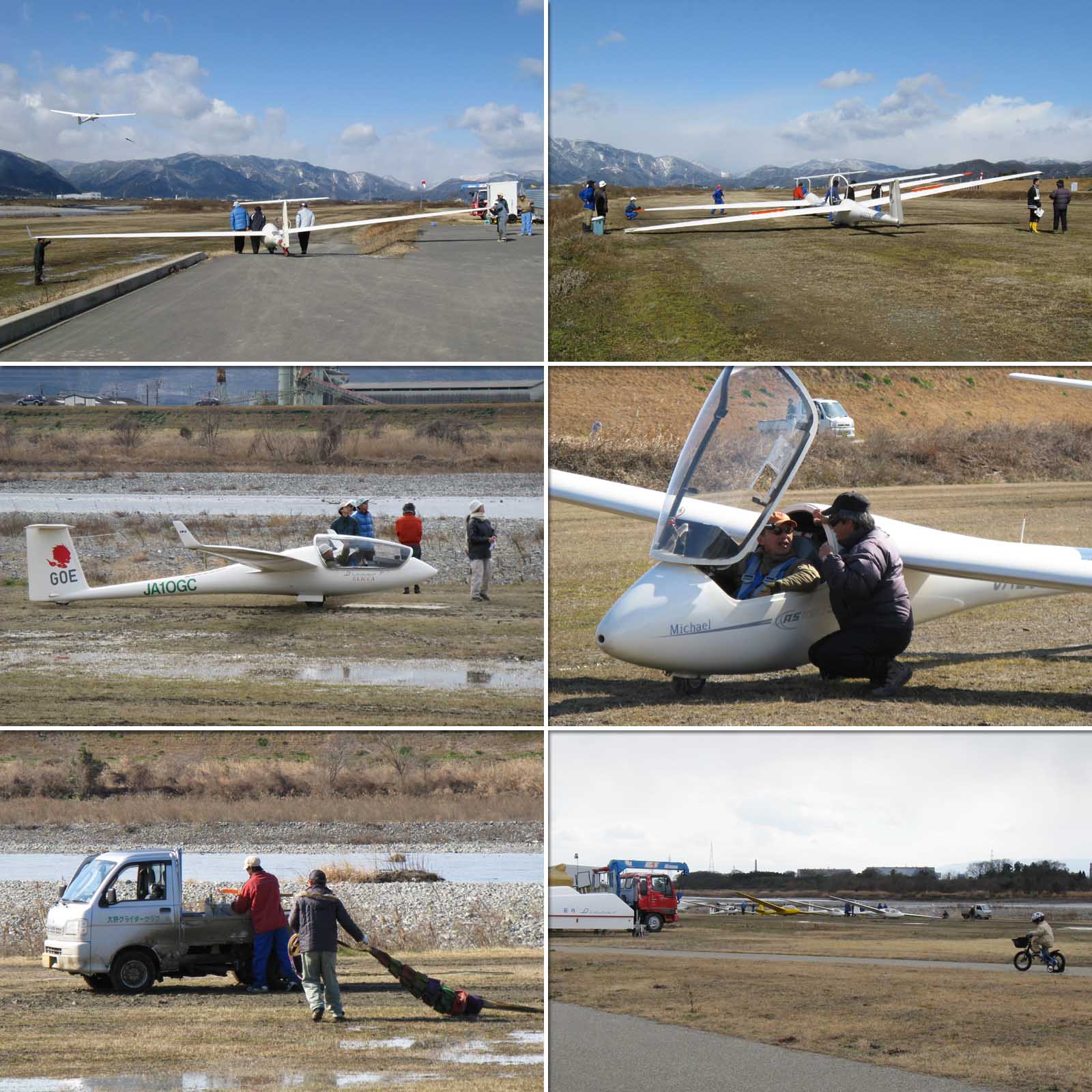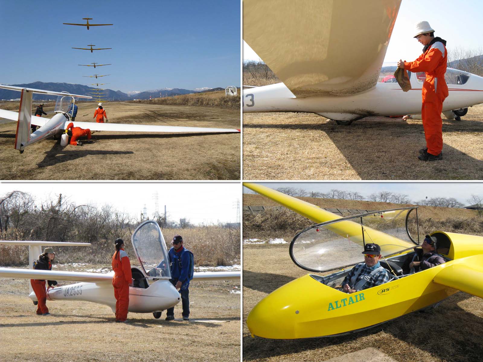 "第48回 全日本学生グライダー競技選手権大会" へ向けての強化合宿で、昨年より大野で行われています。上昇気流も多くトレーニングには最適で、乗りなれた自校の機体を持ち込んでいます。