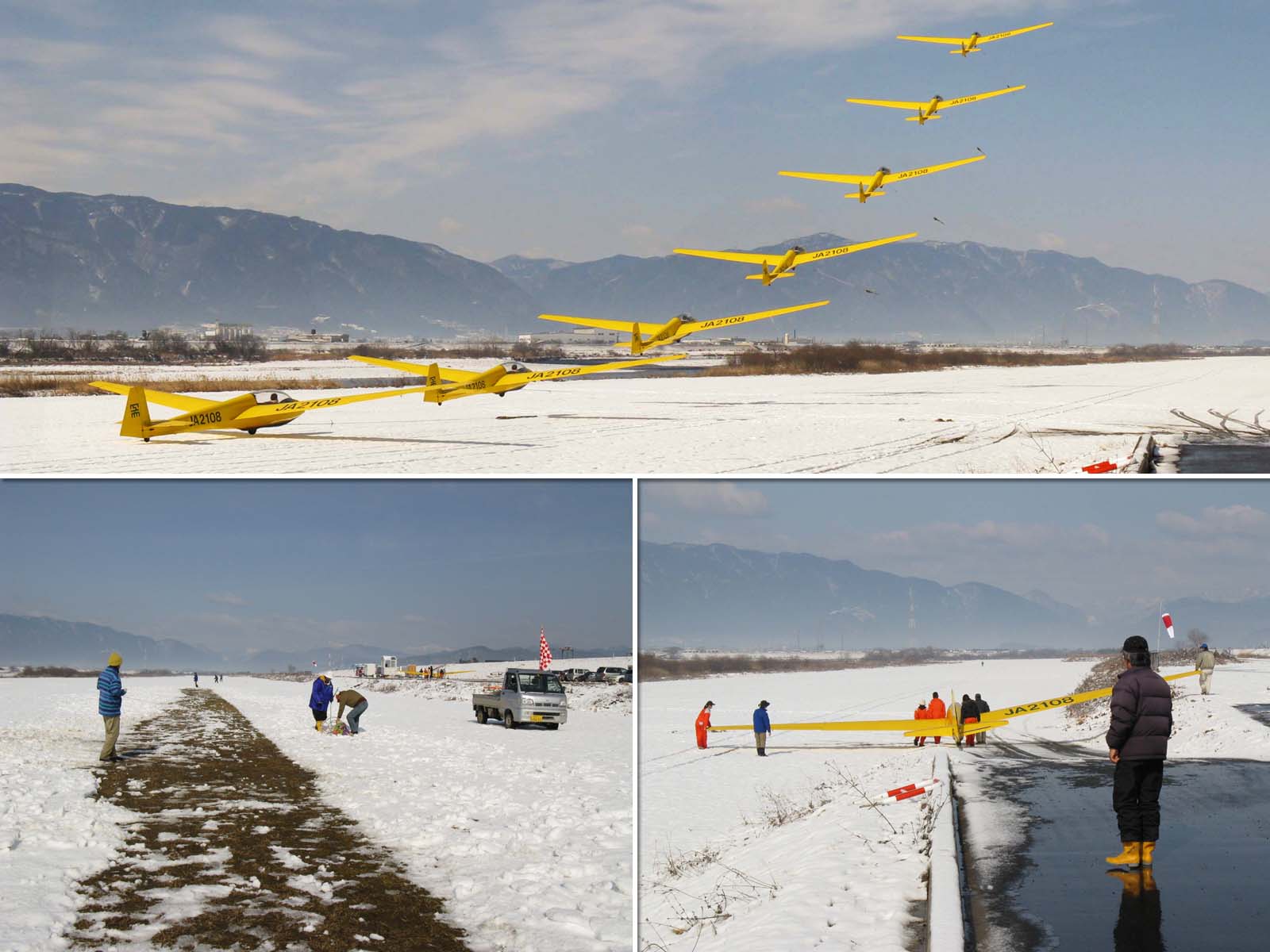 超過料金は風の変わり目に上がった岐阜大学生さんが27分(2108)、大平さんが14分(2333)の2発のみ。地上滑走は1回ごとにコースを変え、路面(雪面)を傷めないように注意が必要でした。