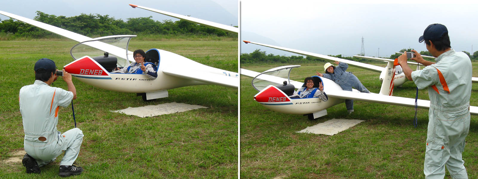 飛行直前の緊張した表情 (写真上段) と初ソロ後の 緩みっぱなしの笑顔が対照的です。