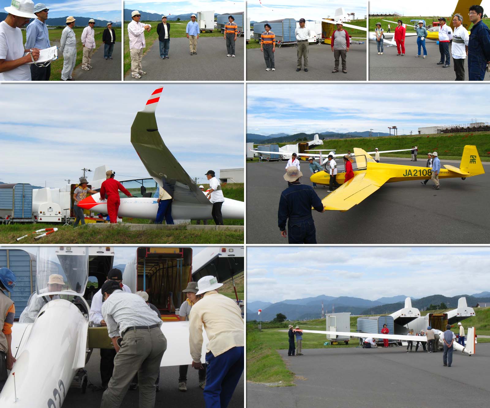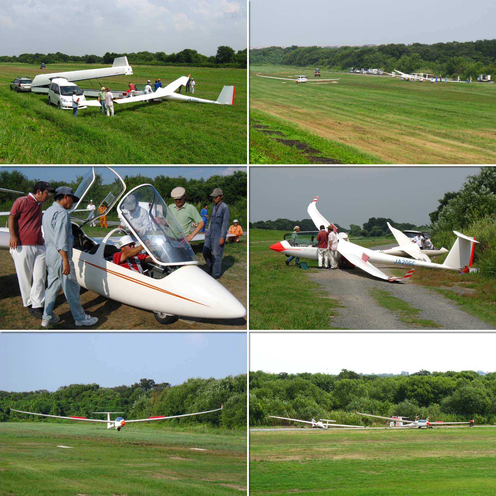 参加者たちは早朝より JA20GC と共に陸路、木曽川滑空場へ移動しました。