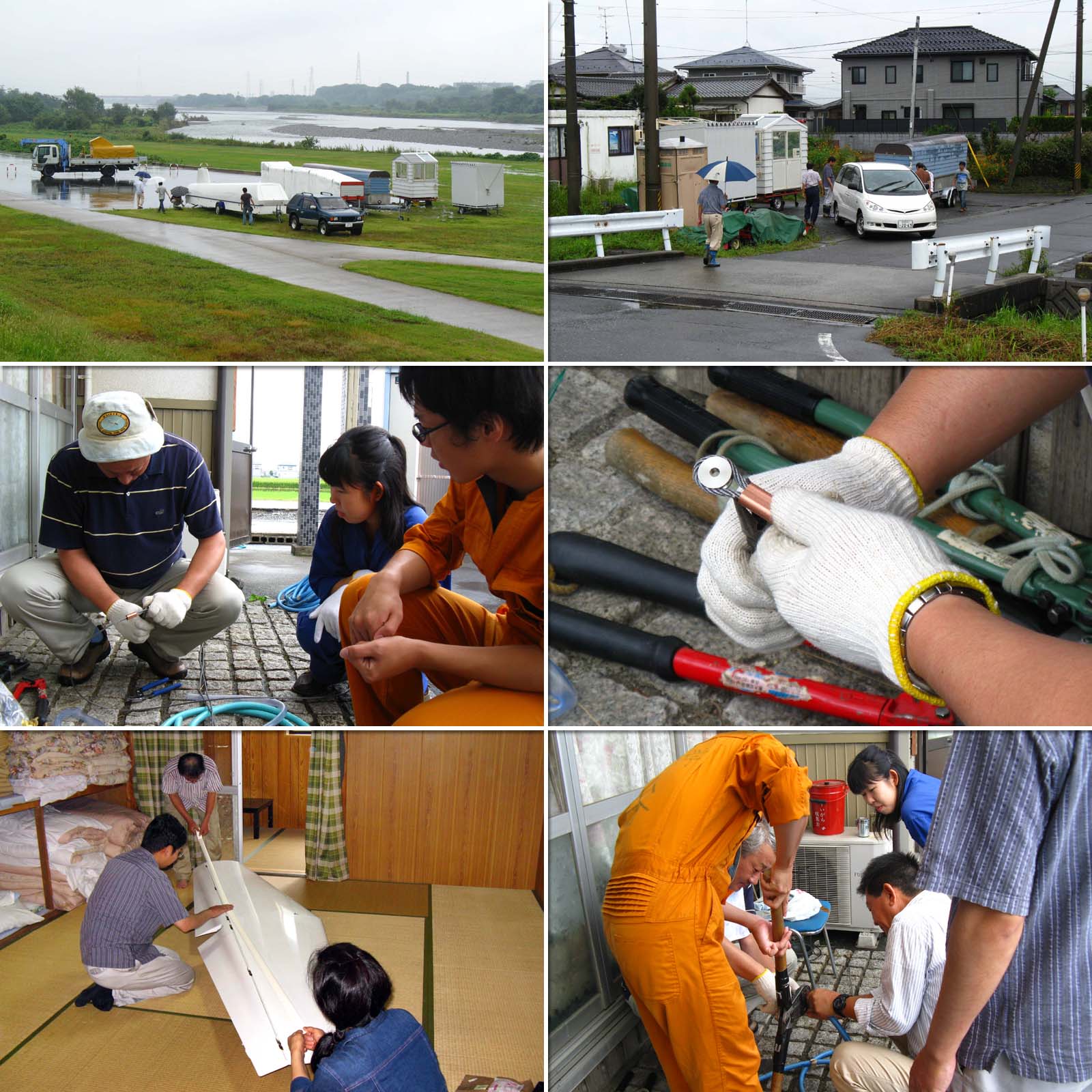 小降りになった処で撤収作業を開始。 平行してクラブハウスでは書類の整理。 宿舎では運航機材の整備、(削除) 雨男の遠山さんがリーダーで (削除ここまで)緩衝索を制作。 (アッ! 雨男が実名なので削除)