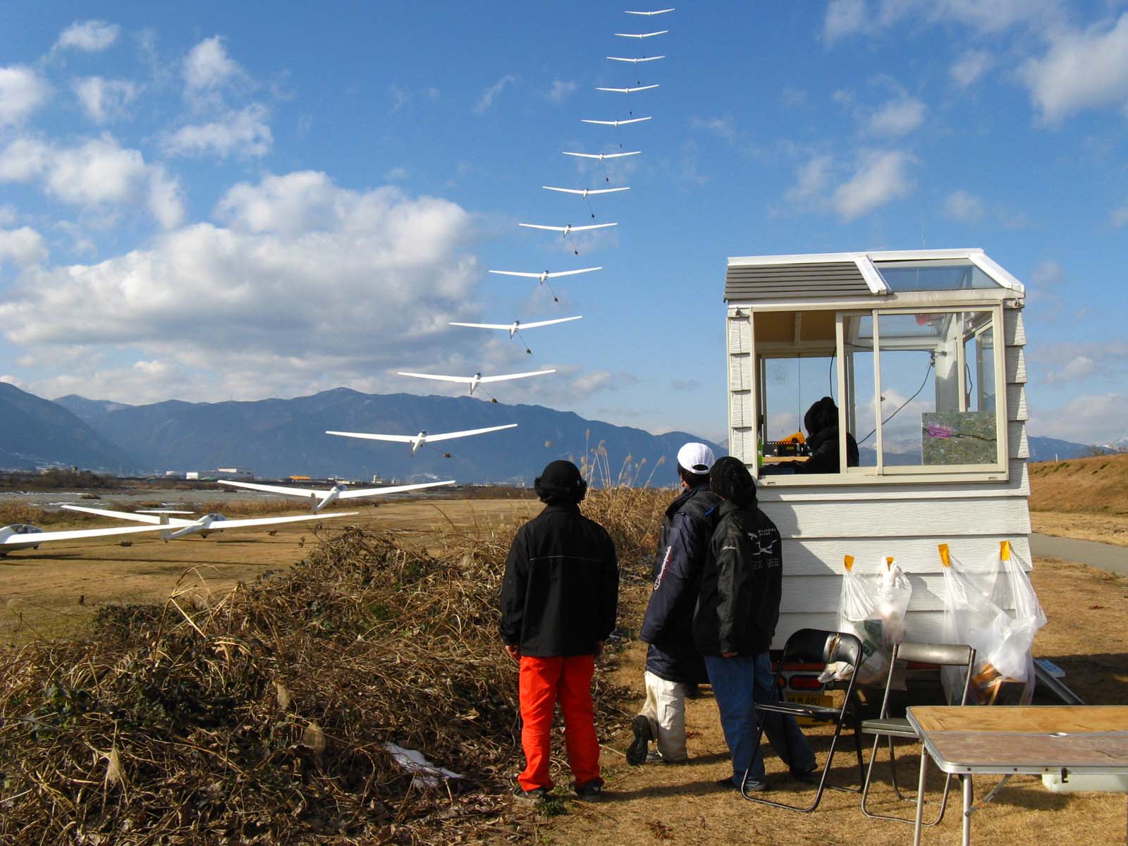 総発数は40発、午前中はしぶく、滞空しだしたのは14時ごろからでした。 超過フライトは7発で最長はOGC近藤さん+田中教官の1時間でした。 (写真右上)