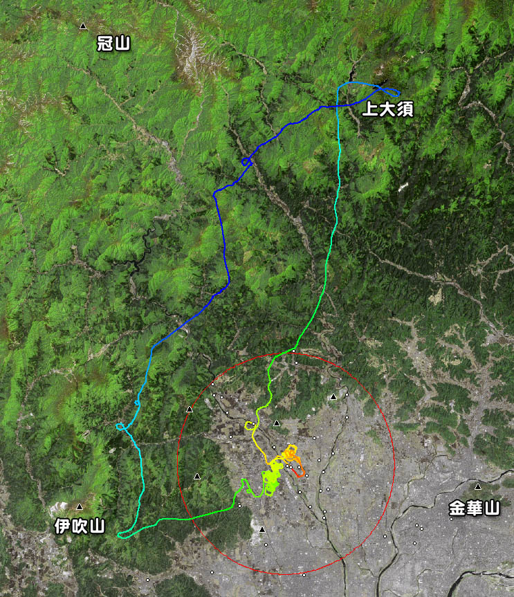 大野滑空場〜上大須〜川浦〜徳山へのダム巡りの航跡です。樽見〜徳山ダムの方面では、雲の切れ間が有り、雲の上に出る事ができ、遠くに白山、乗鞍、御岳が望めました。