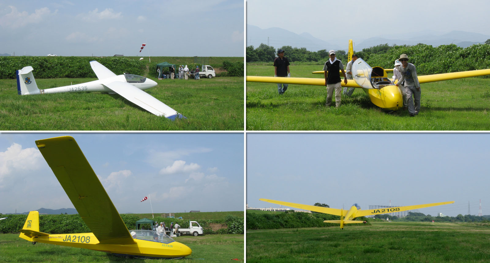 100710 OGC単独_02 12:19 風の変わり目に JA2108 が 56 分の飛行、その間に地上はピス交実施。 汗ビッショリで下りてきた近藤(健)+苅谷ペアは緩みっぱなしの顔で機体を運搬していました。