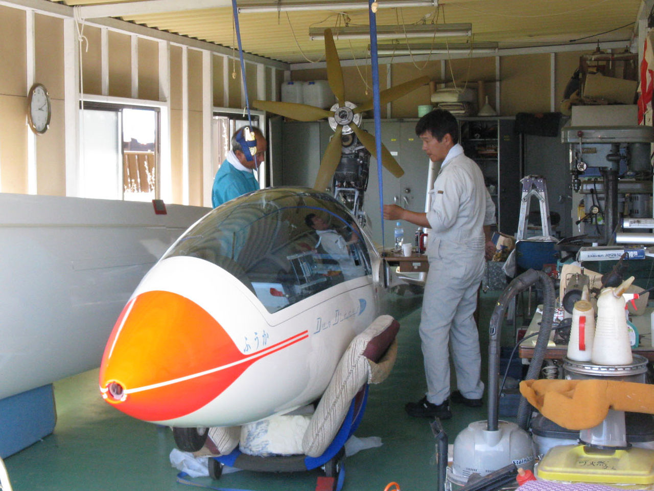朝、宿舎併設の整備工場で JA20GC を組み立て 計測を行う。