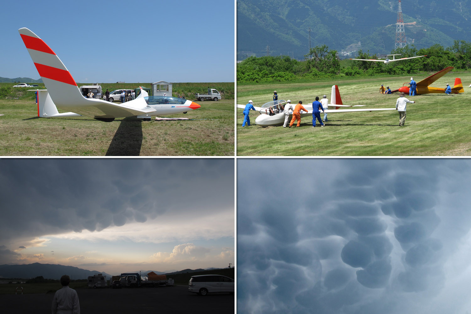 120505 乳房雲 飛行が終わり撤収作業の頃から日没まで、珍しい形の雲が現れました。 強い下降気流の発生を示唆している 乳房雲 でした。