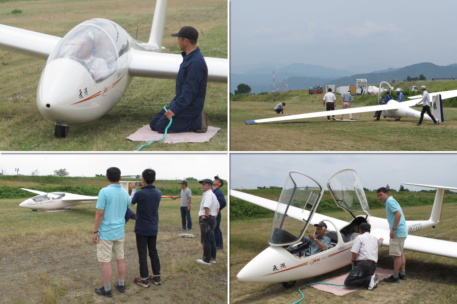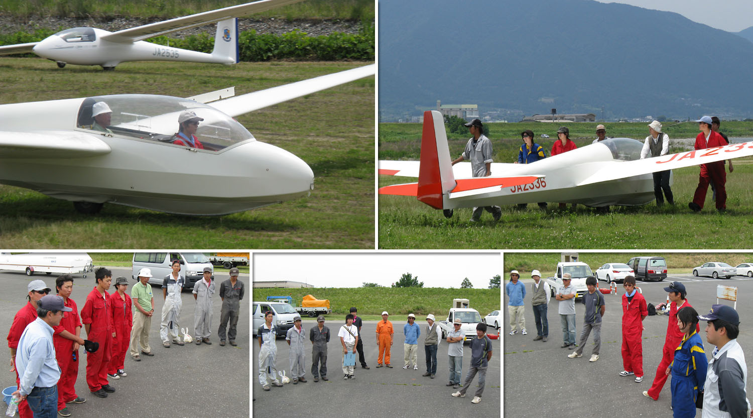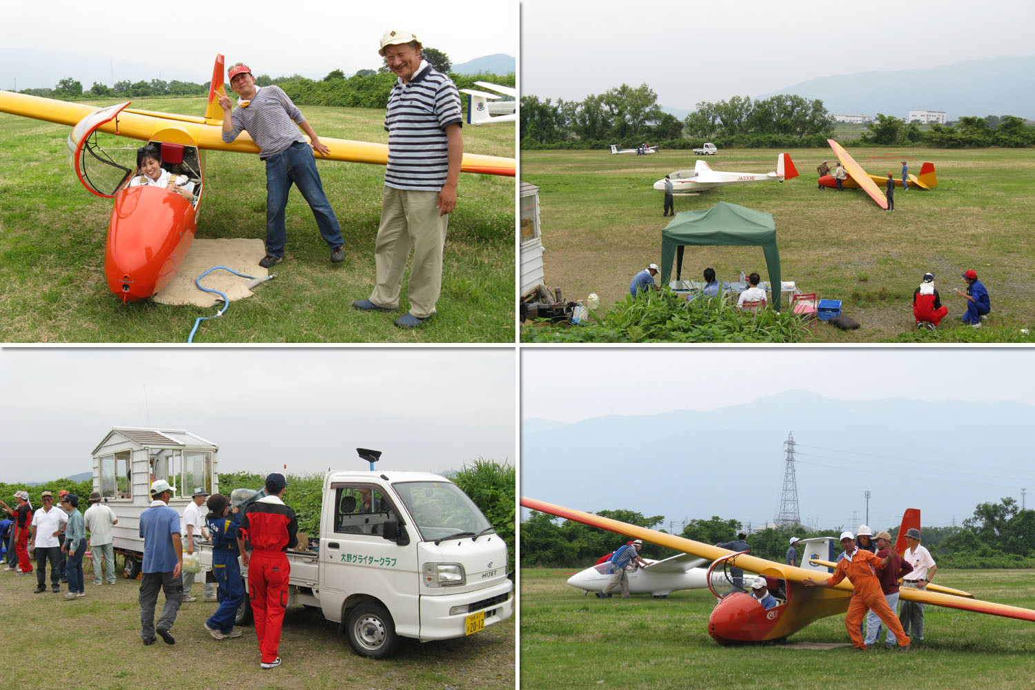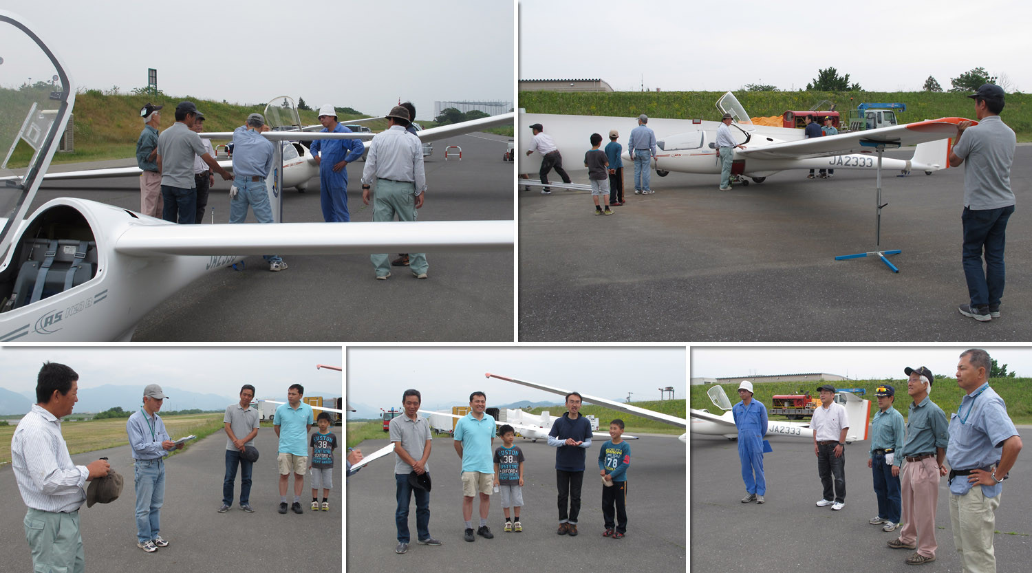 参加人数が10名と少なくゲストの皆さんに一日中お手伝い頂き何とか無事に乗り切れました。 ゲストは京都大学グライダー部の OB 3名+ジュニア 2名、それに加えて、遂に武田会員が女性を連れて来ました。
