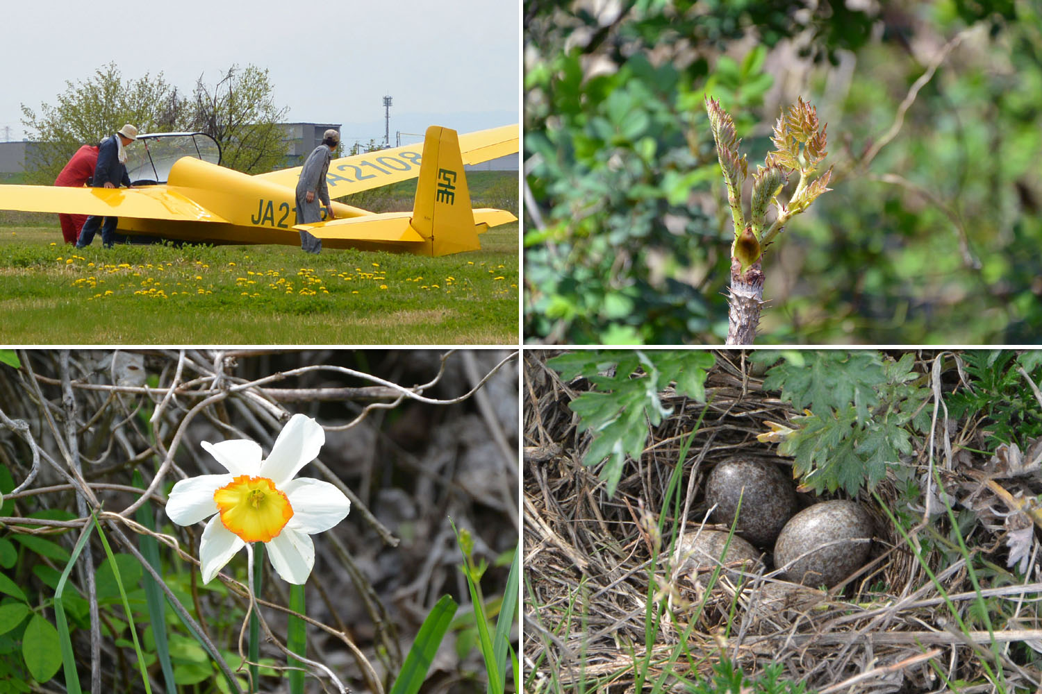 150411_OGC単独-01 桜は過ぎて黄色のタンポポ、タラの芽、口紅水仙、ヒバリの巣には卵が4個、春がいっぱいの大野滑空場です。