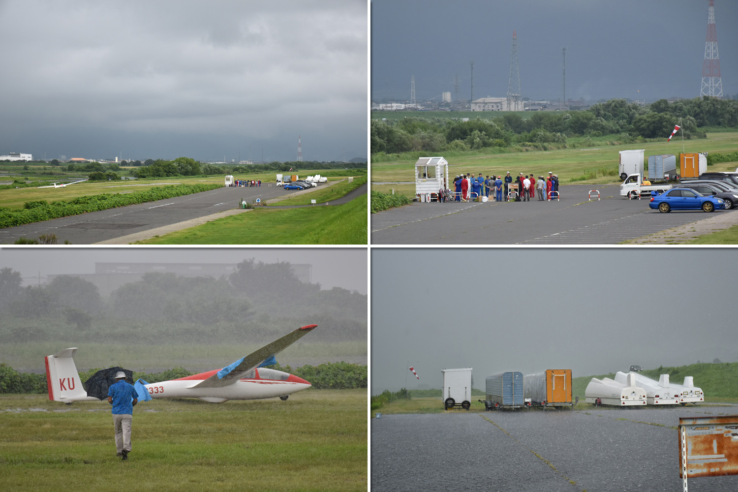 怪しい空を見上げながら、 7:44 から飛行開始、2 発目の飛行が終わってから雨になり 9:30 まで待機、その後空の様子を見ながら ASK21 単機で飛行再開。