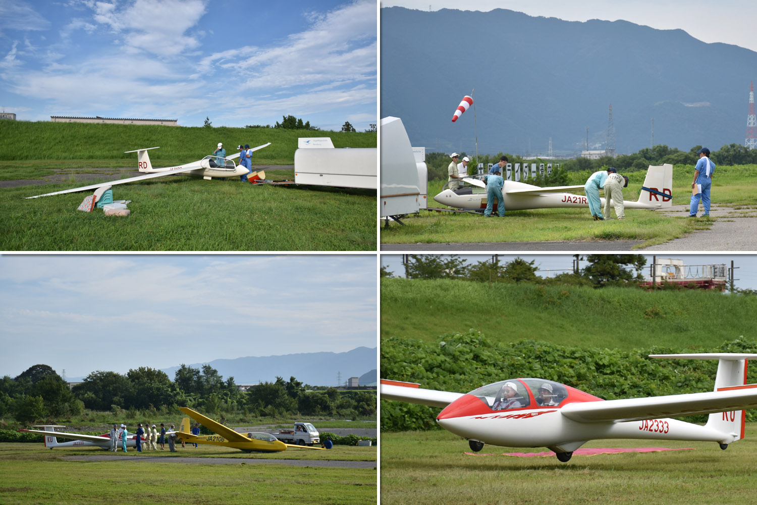 南山大・中島くん+松本教官の 36 分 (ASK13) を始め計 4 発が滞空、17:09 最終着陸で総発航数は 41 発。 明日は台風接近のため飛行中止です、滑空場から運航機材を全て撤収しました。