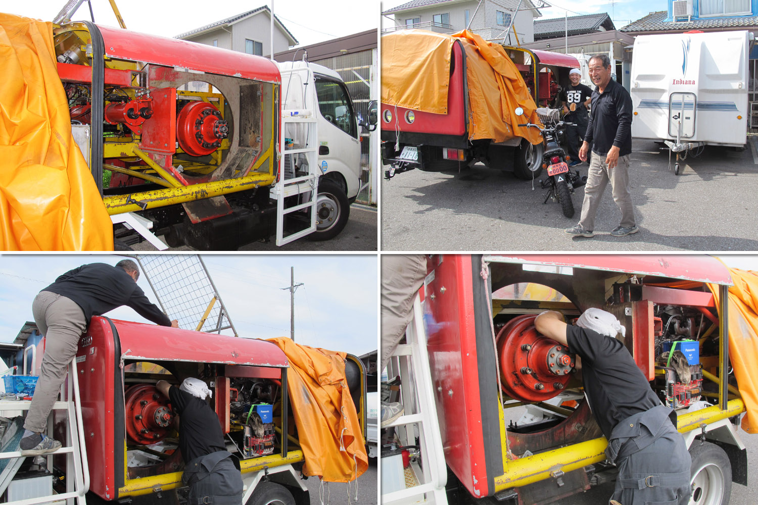 一方、宿舎駐車場では山本会員がクワトロ・ウインチのブレーキ修理を続けています。