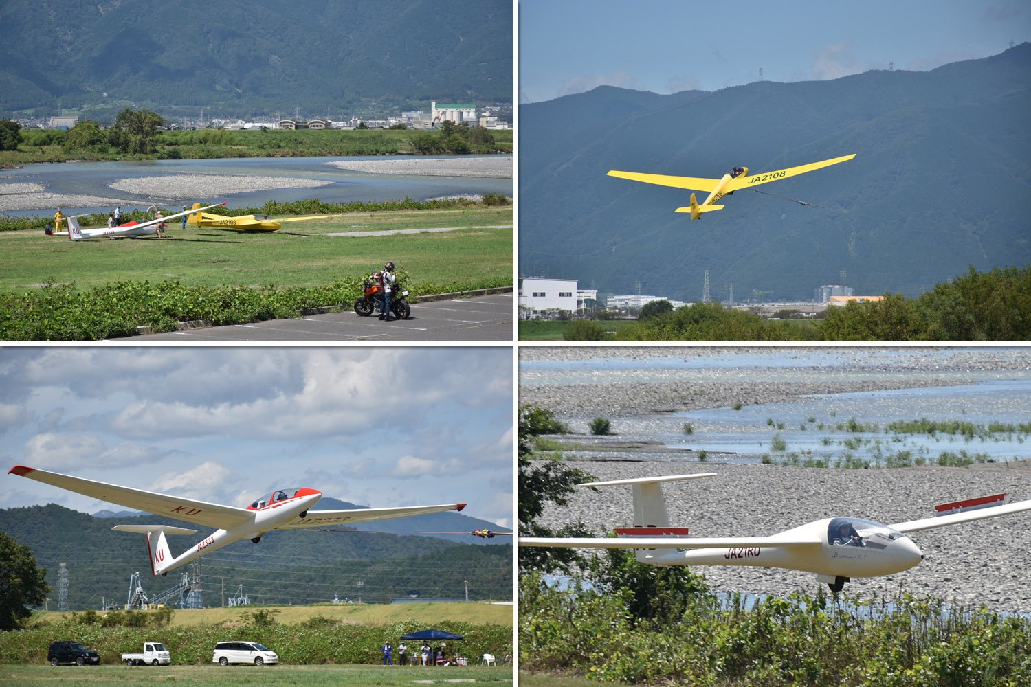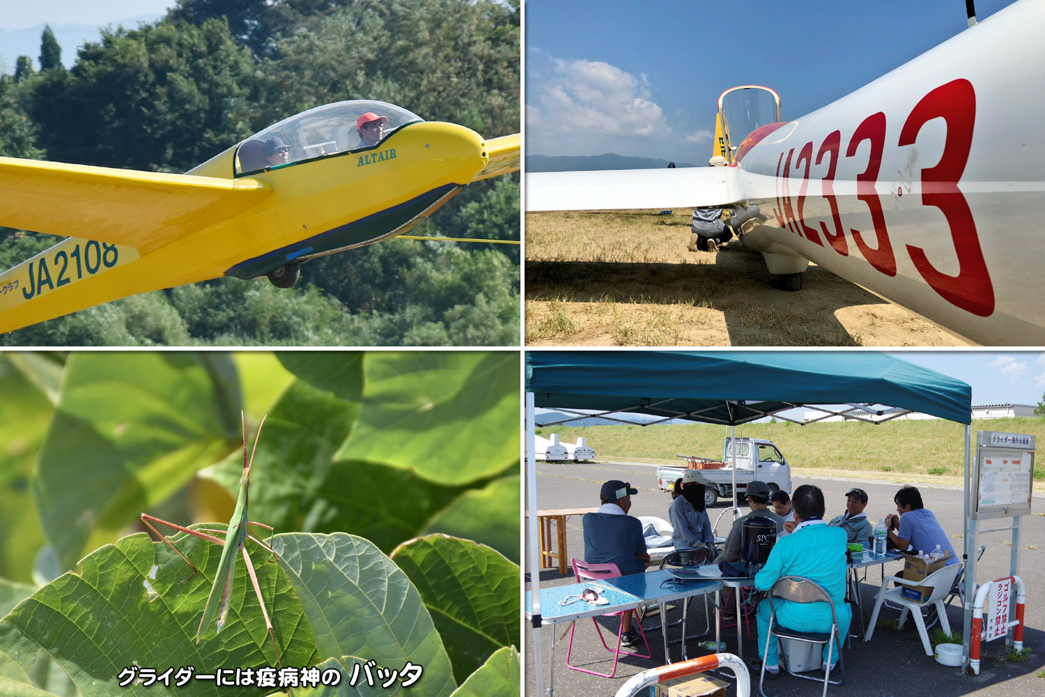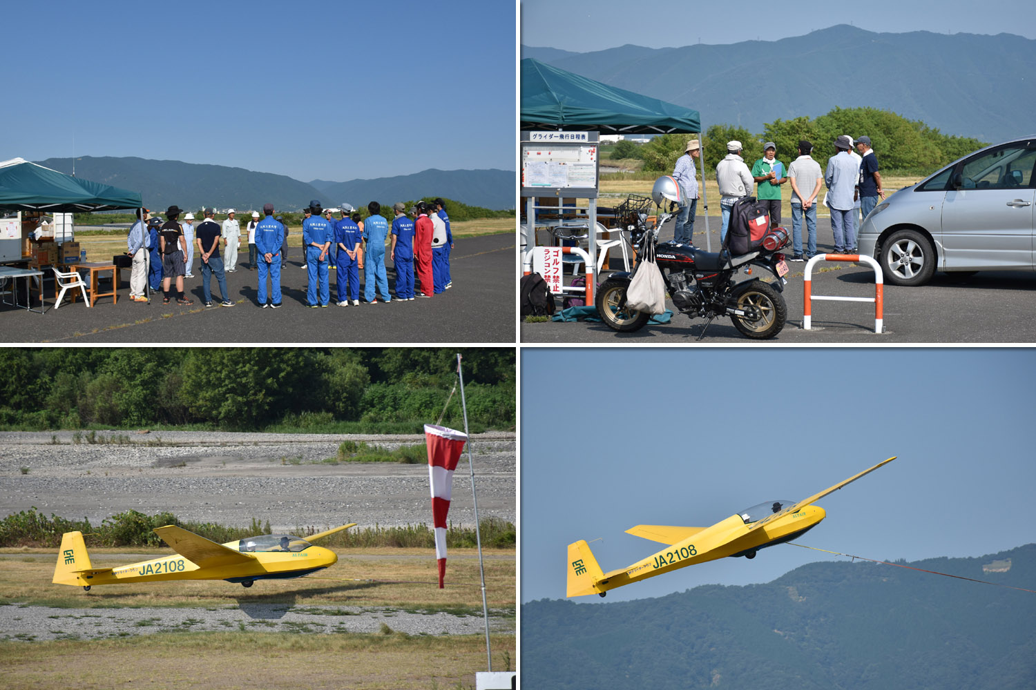 本日は OGC 会員が 15 名ほど加わり総勢 38 名ほどになりました。 昨日と同じく猛暑の中、JA2108、JA2333、JA2128 の 3 機体制で飛行。 早朝から大久保会員が連れて来た古川さんが体験搭乗を行った後に入会、今夜は宿舎一泊で明日も参加される事になりました。