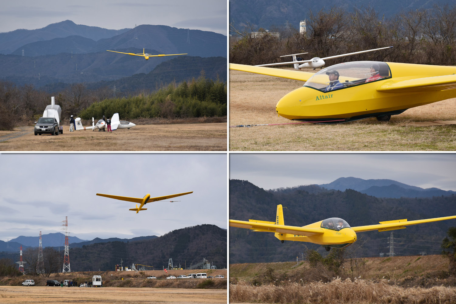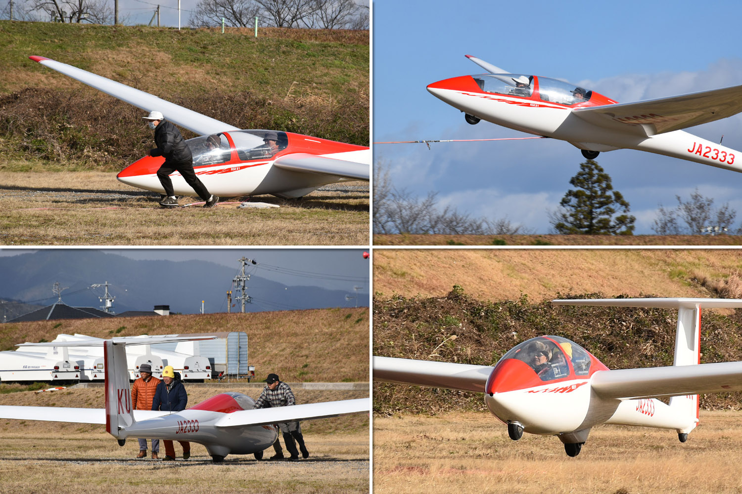 準備した機体は、ASK13 (JA2108)、ASK21 (JA2380)、ASK23 (JA2535)、Discus (JA01TD)の 4機。 飛行開始は昨日より早く、8:19 。 当初、北向き発航で開始しましたが、11時頃になると川風から背風に変わり川上へピストチェンジ。