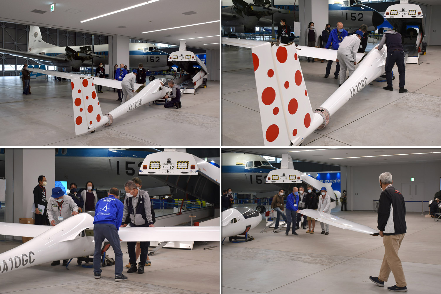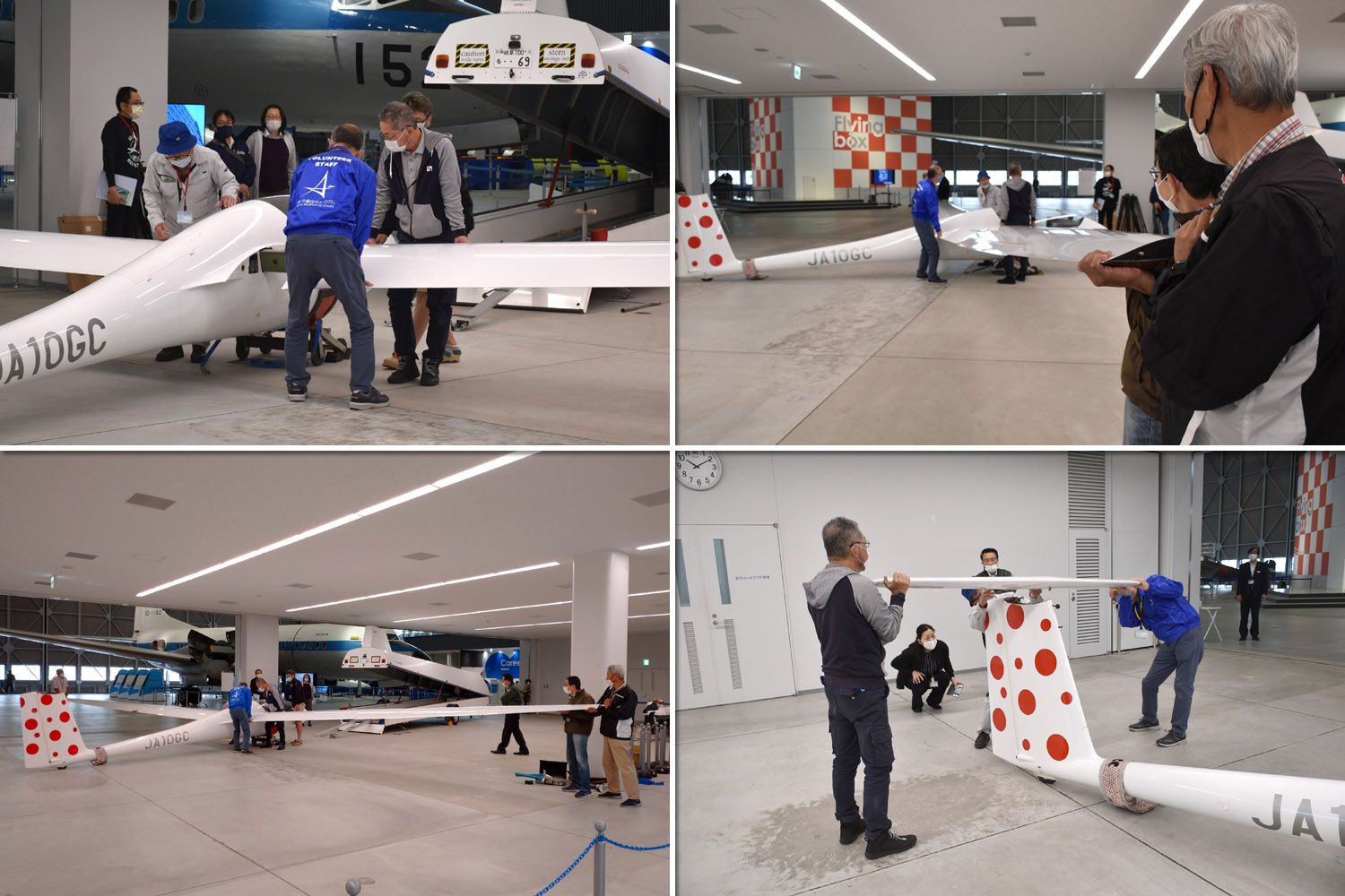 展示会初日は、グライダーの組立を見学するために早くから来場の方がいらっしゃいました。