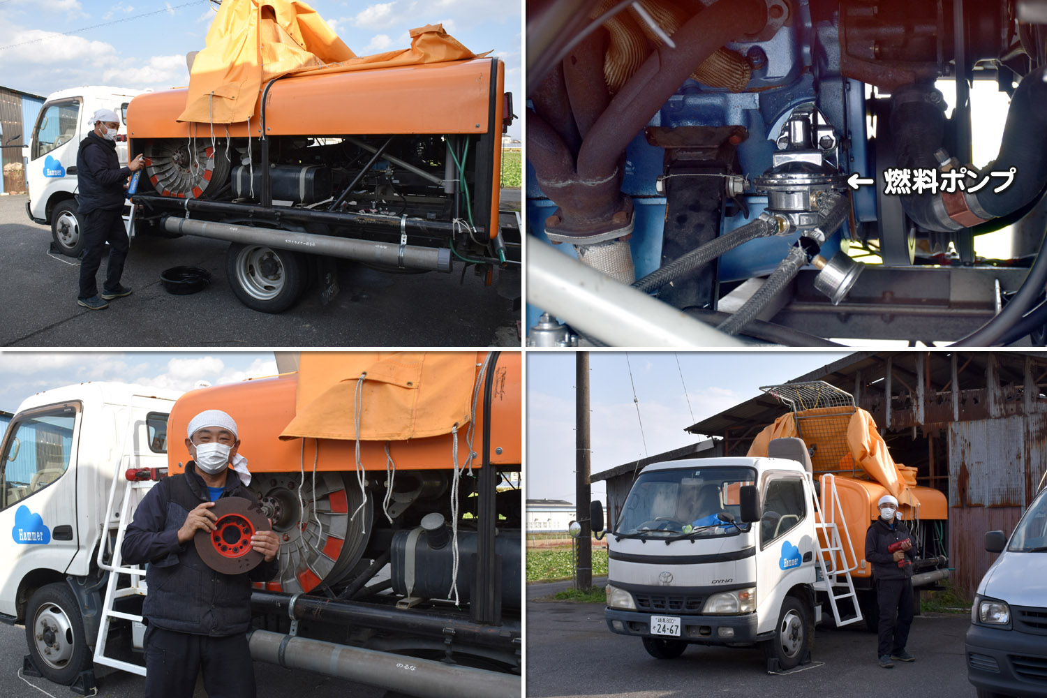 一方、宿舎駐車場では ウインチ (ハンマー) のメンテ作業 ・・・・ 新しい燃料ポンプ取付やキャブレターの空燃比調整などの作業が進んでいました ・・・・ 担当山本会員。