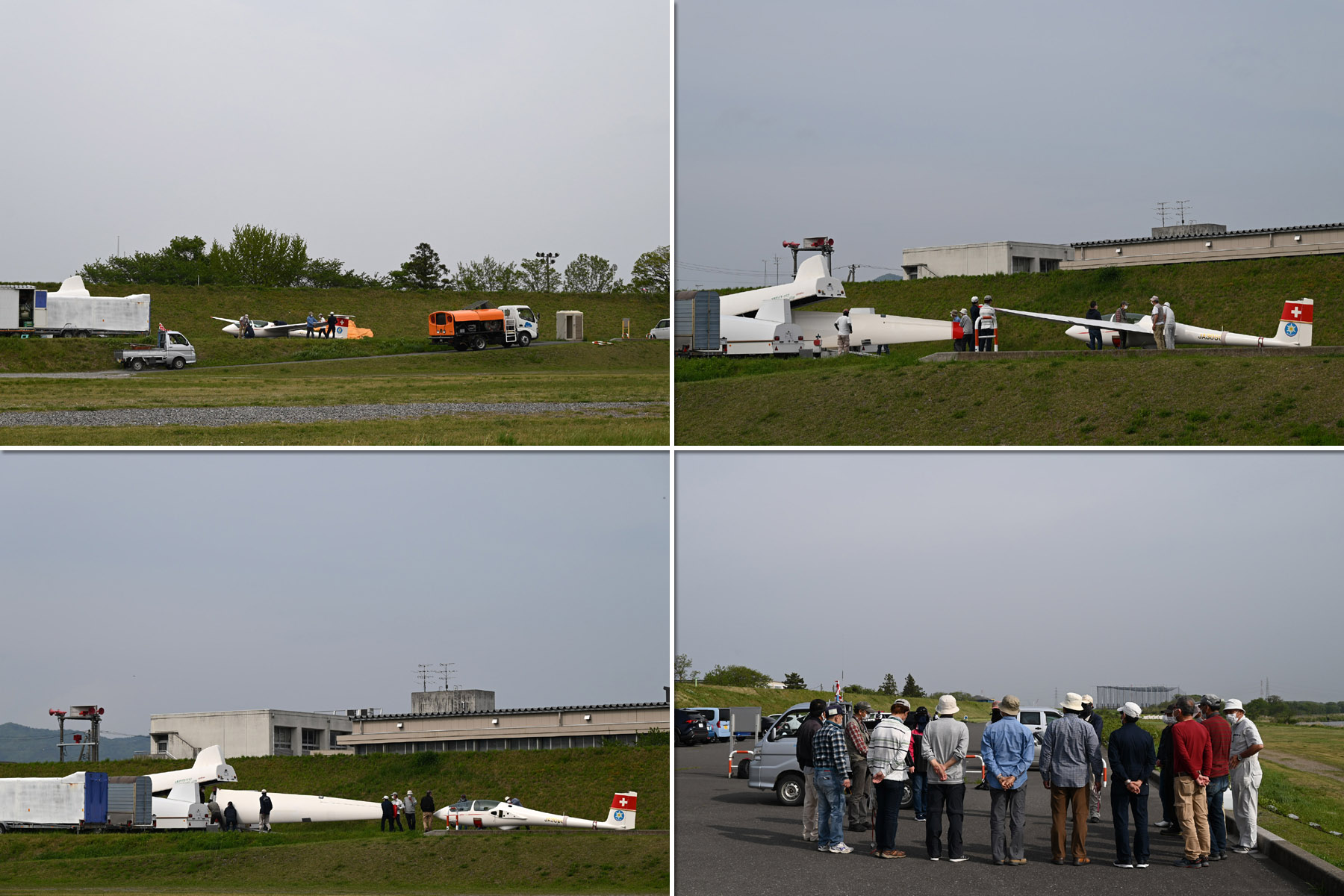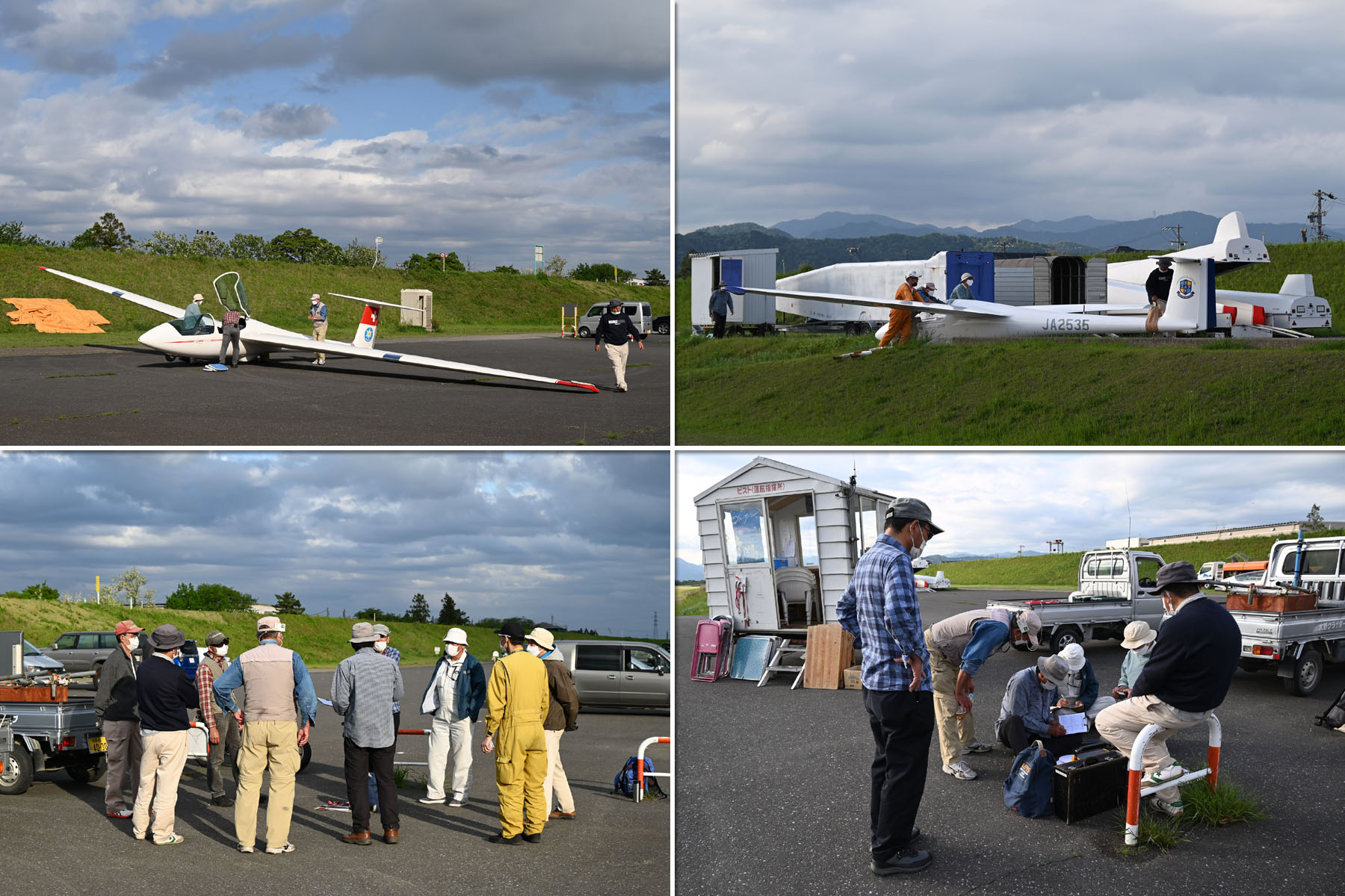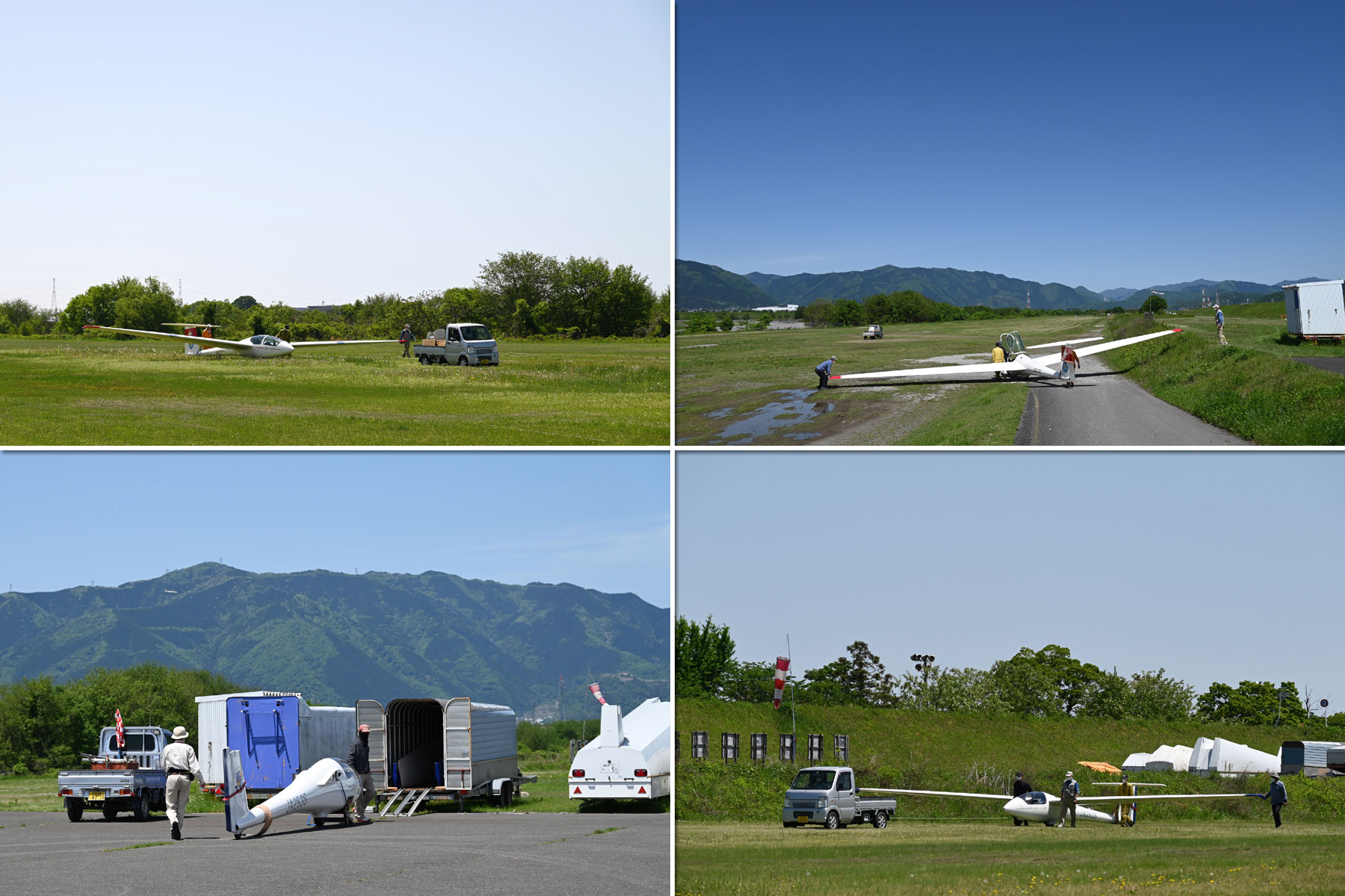 集合時は北風が強かったものの、JA30GC が組みあがった頃には南風が入り始めて機体を川上へ運搬。南向き発航で 10:39 運航開始、飛行を行いながら 単座機 ASK23 を組んで川上へ運びました。