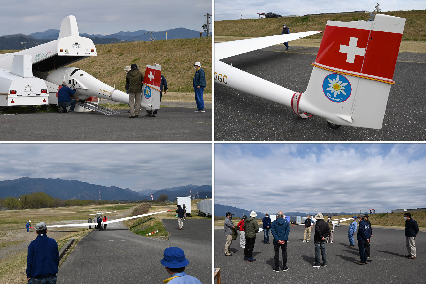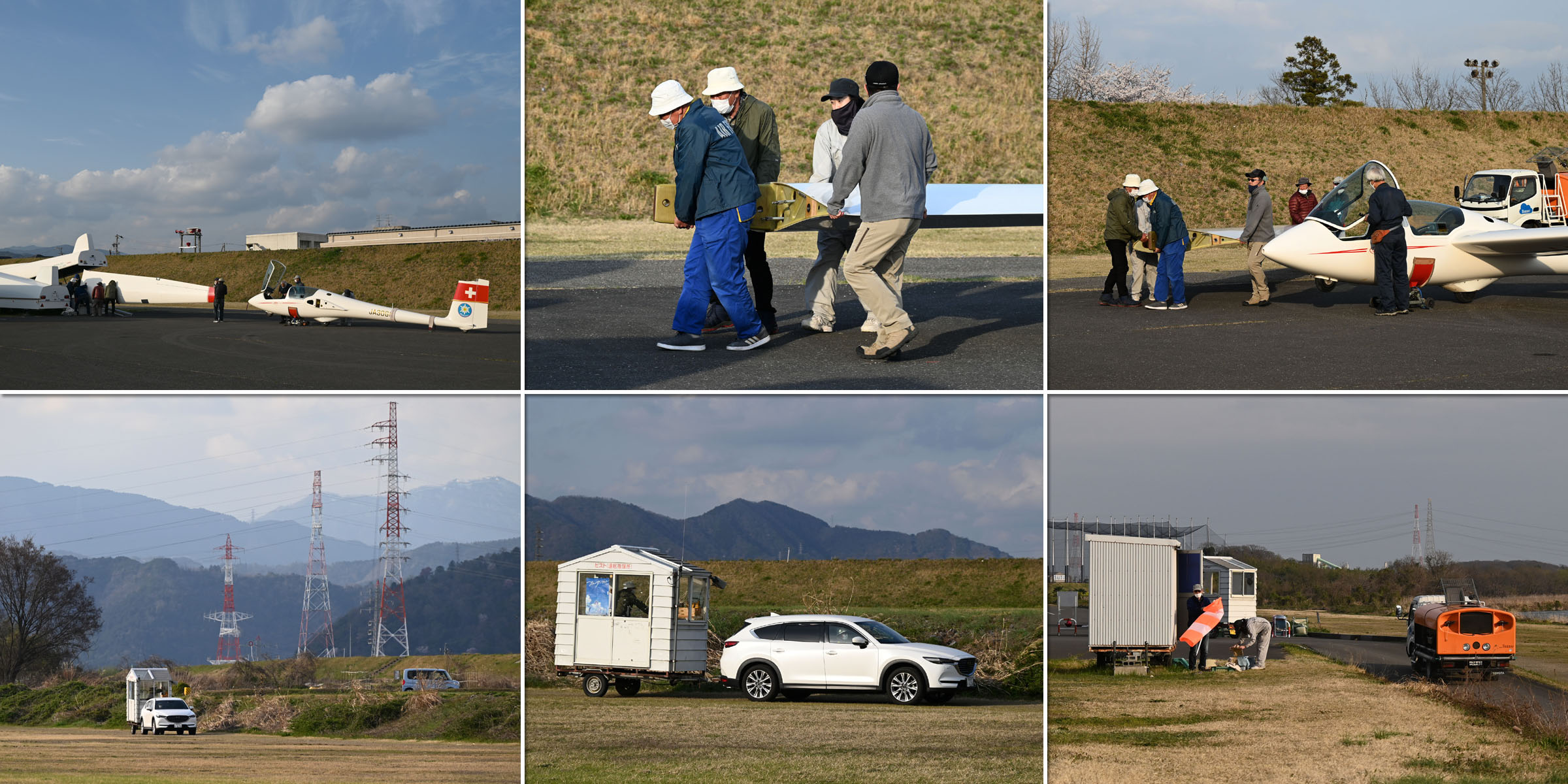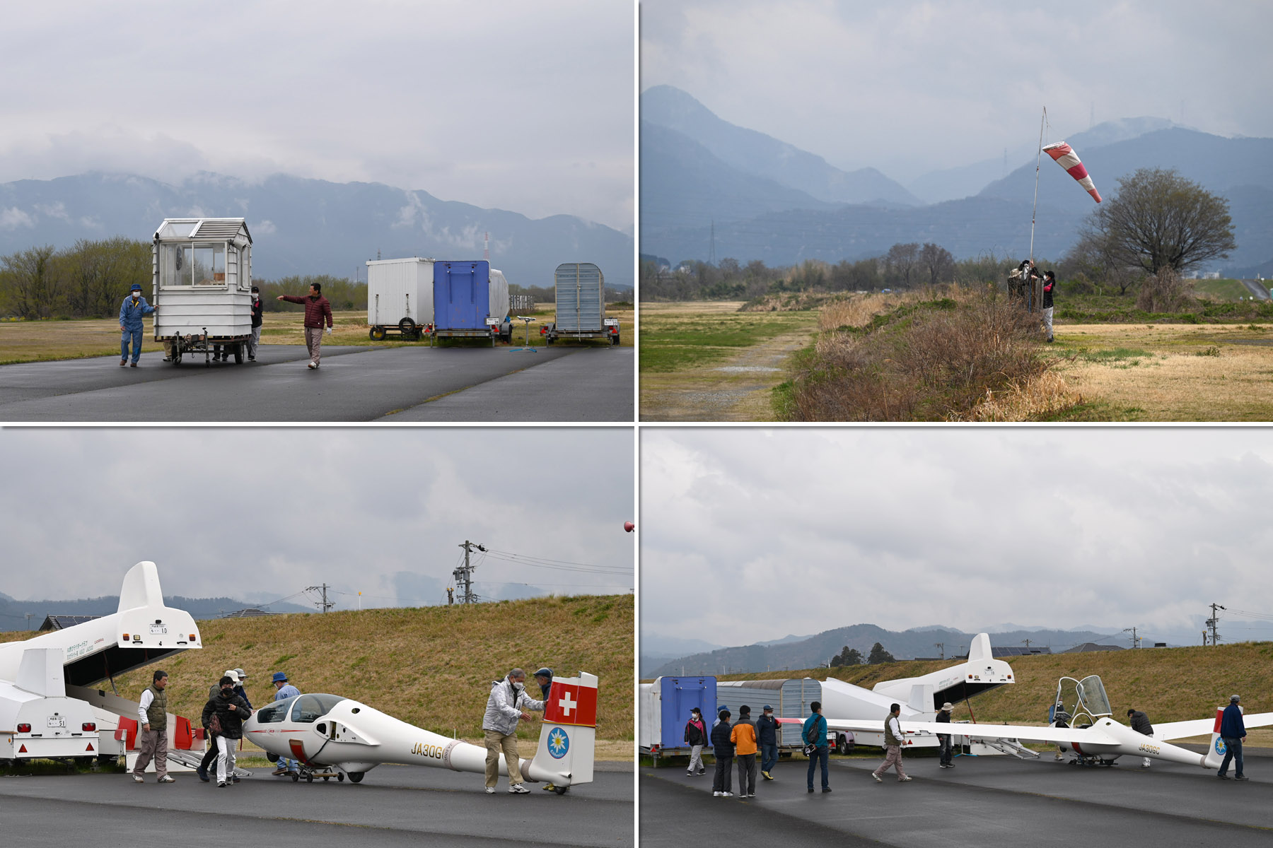 集合時は北風が強かったものの、JA30GC が組みあがった頃には南風が入り始めて機体を川上へ運搬。南向き発航で 10:39 運航開始、飛行を行いながら 単座機 ASK23 を組んで川上へ運びました。