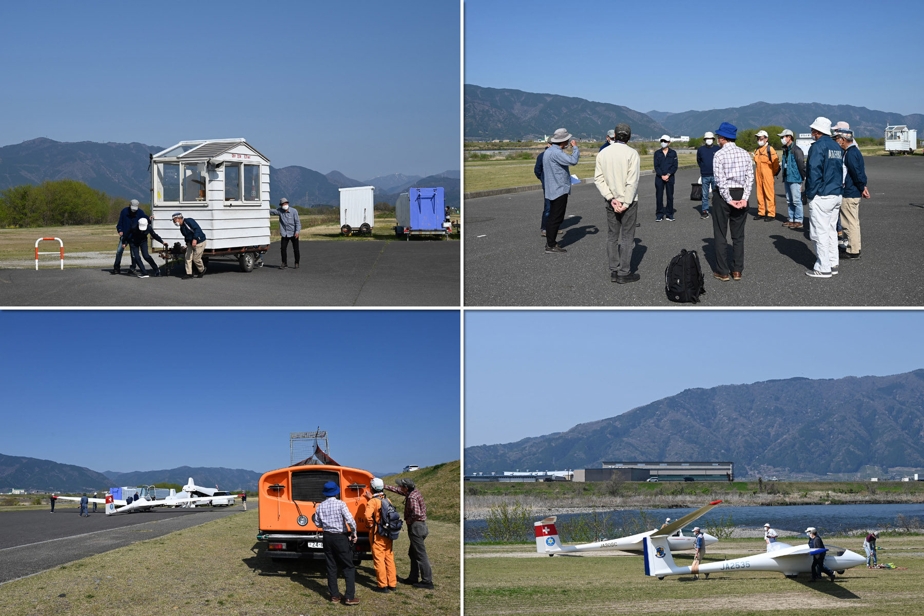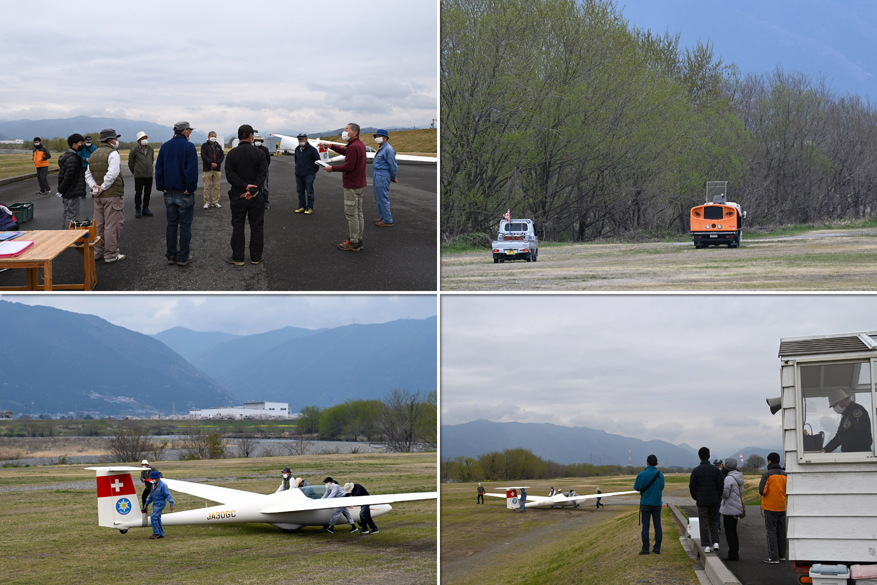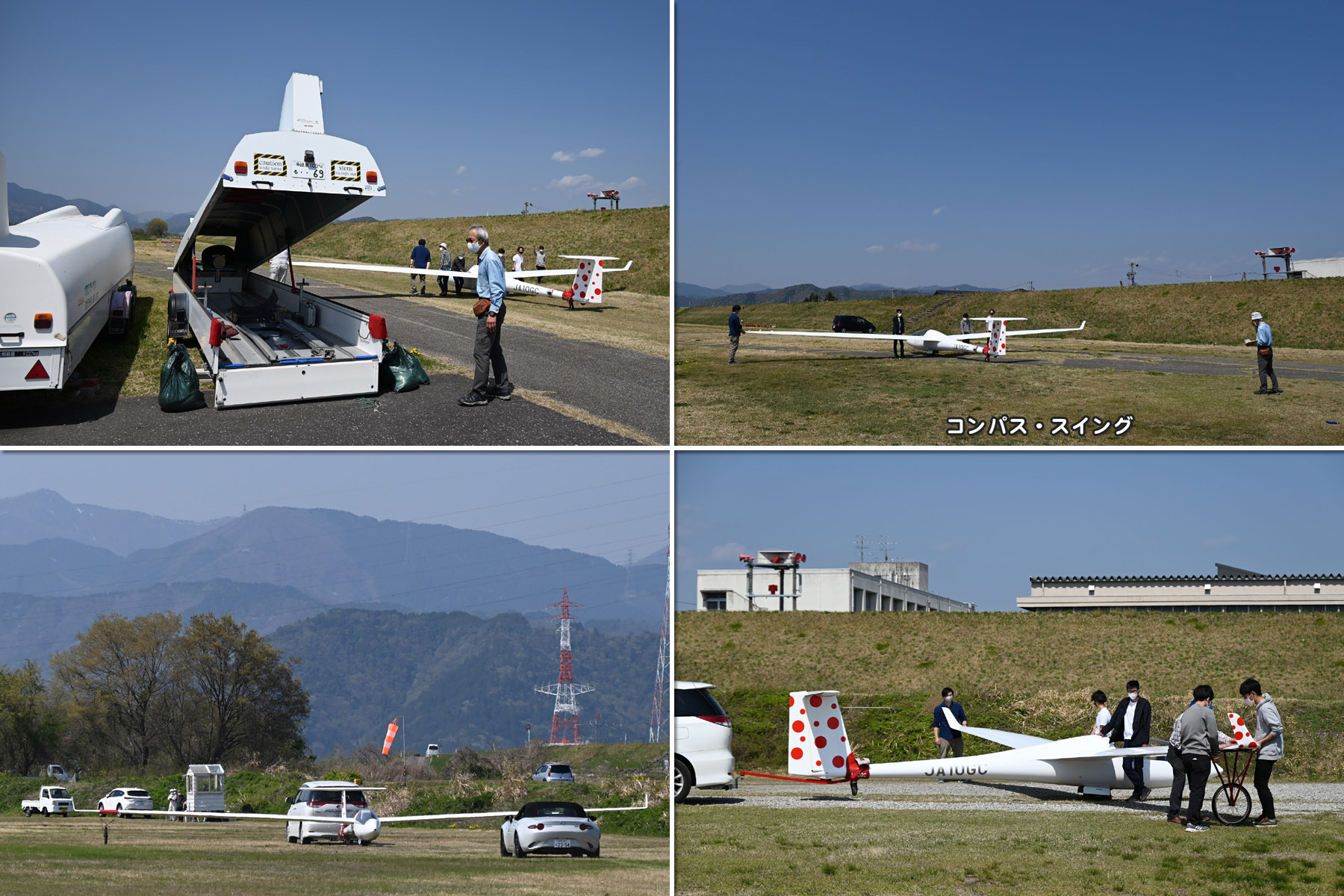 本日は木曽川滑空場が横風強風予報のため、新入生勧誘体験搭乗を大野で受け入れる事になりました。 そのため、応援学生が24名、応援教官も 4名参加して、8時30分には JA30GC、JA2108 も組み終っていました。