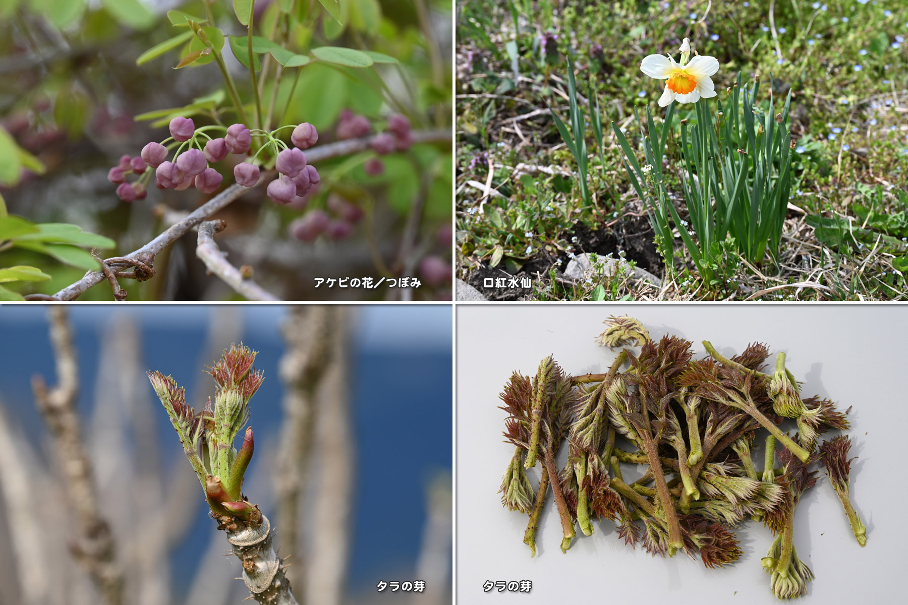 その後南風に変わり川上へランウェイチェンジ、南向き発航に変わってから更に条件は好転し滞空連発 (時間制限 30分)でした。 滑空場の川上へ行くと、自生するアケビの花(つぼみ)、タラの芽、口紅水仙などが見られ、春を感じます。