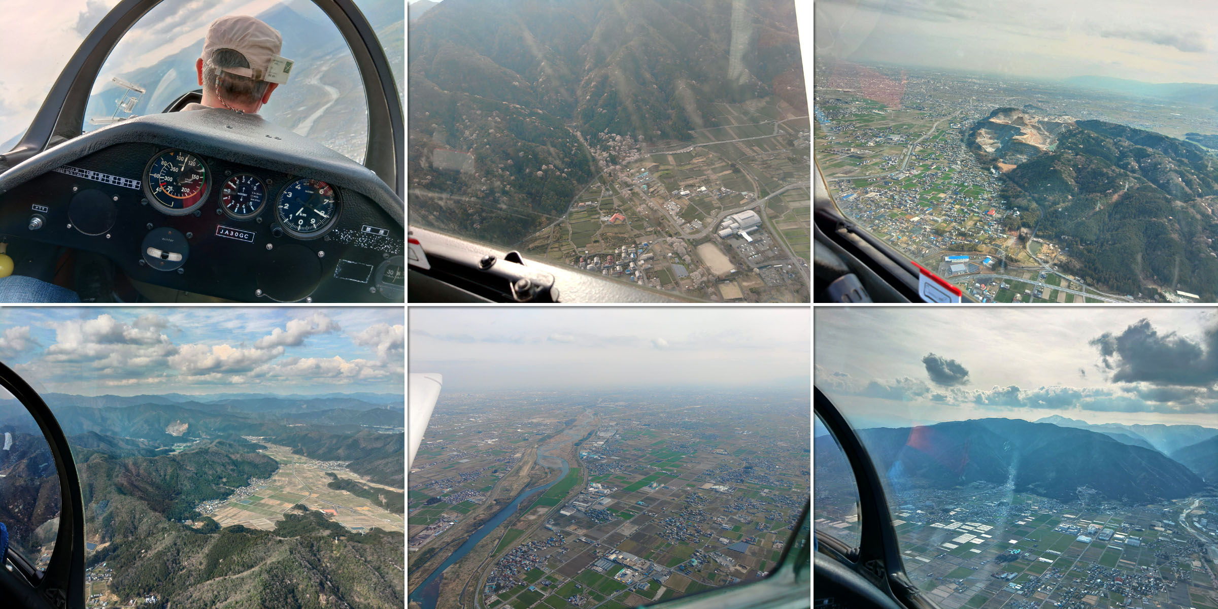終日、正対強風 (揖斐川アメダスは 12m/s 記録) のため JA30GC のみ運航に使い JA2108 は駐機場で新入生への説明などにして単機センター発航、9:03 から飛行を始めました。