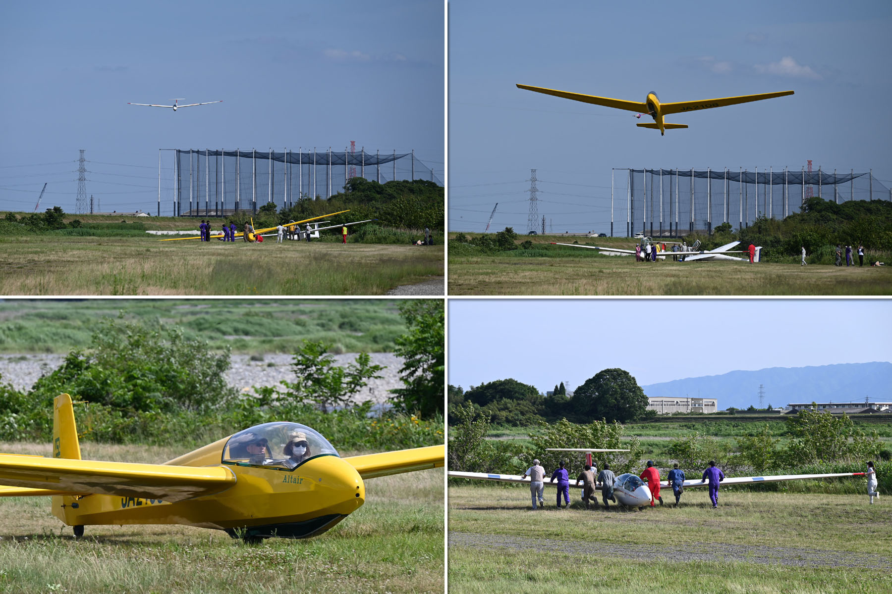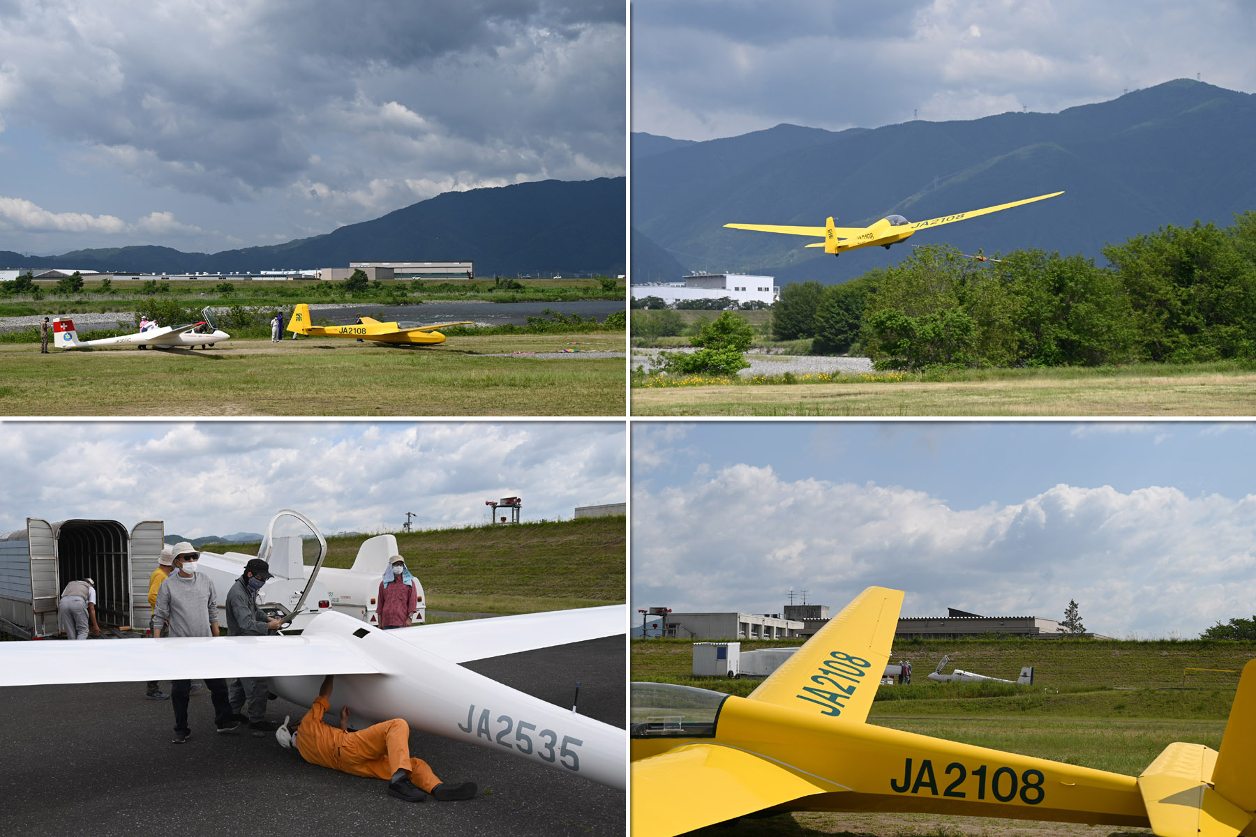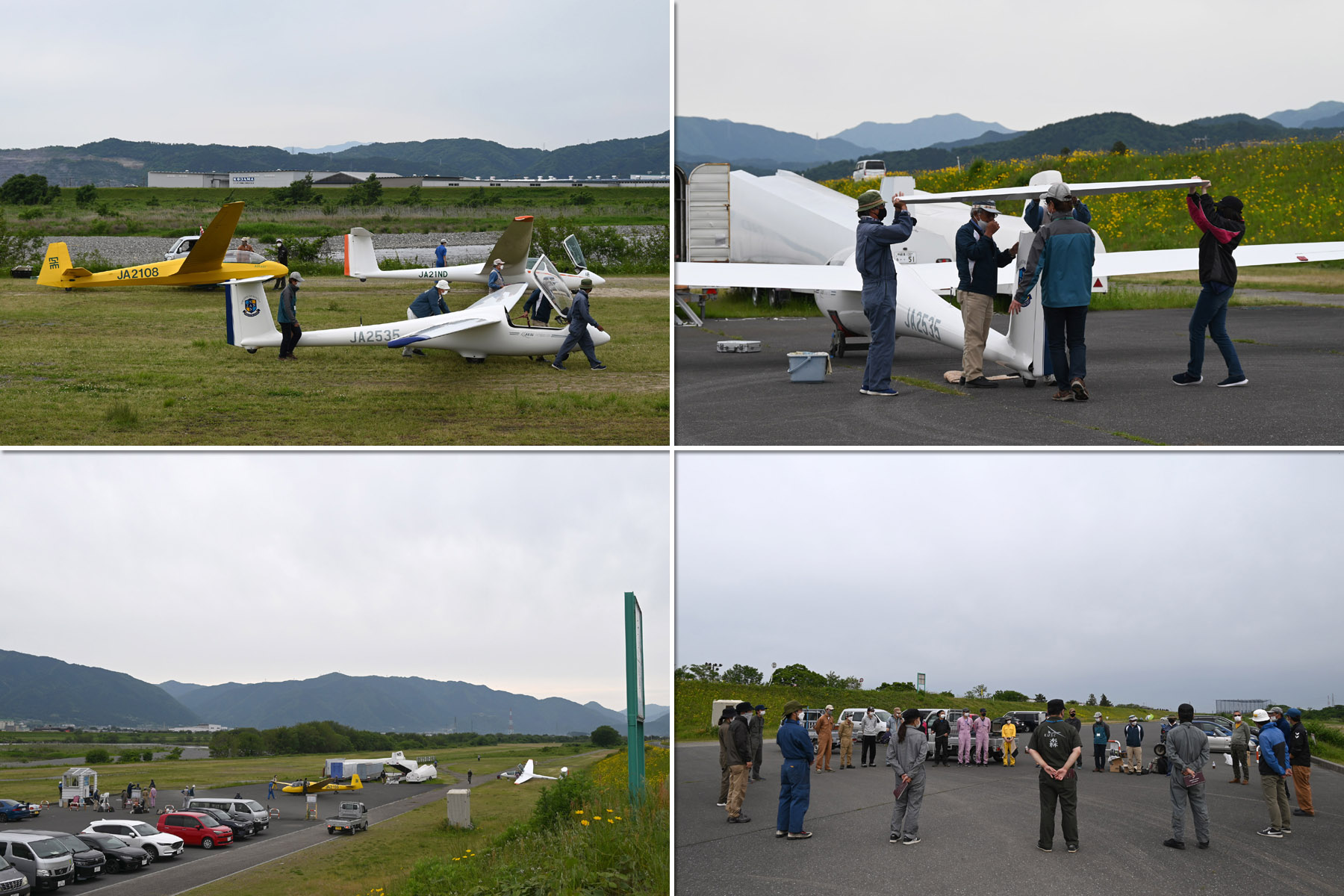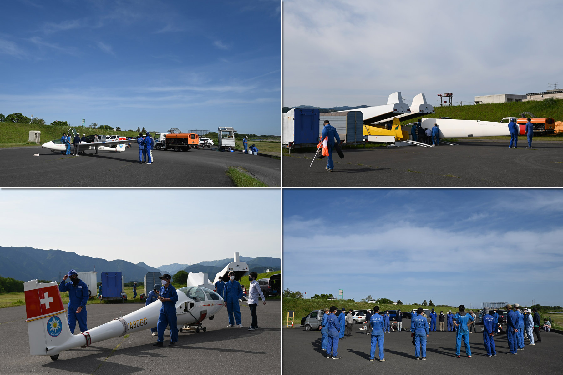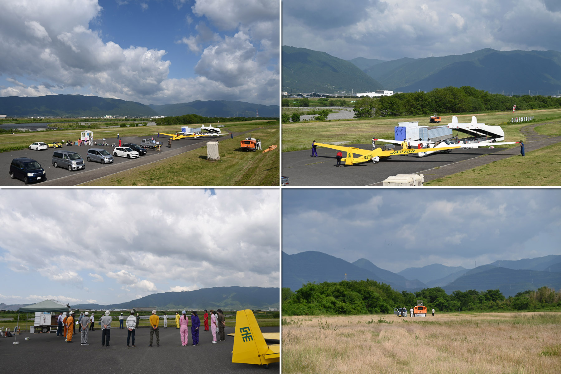 このような状況下でしたので、初合宿の京大 1回生 5名 (黄色のツナギ姿)がいたものの、総発数は 50発になりました。 概ね 1人 2発程度回ったところで、最終着陸 15:48 と少し早めの撤収となりました。