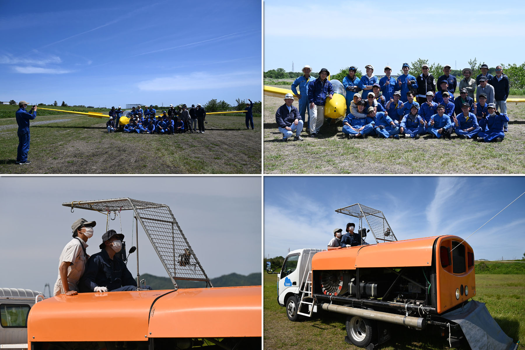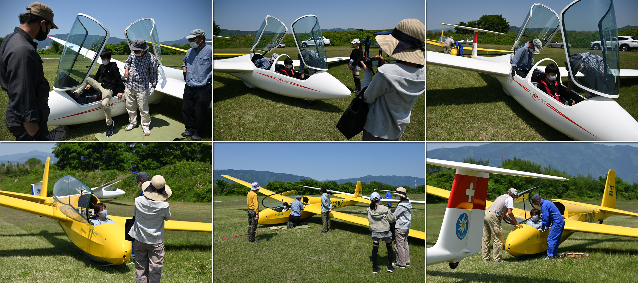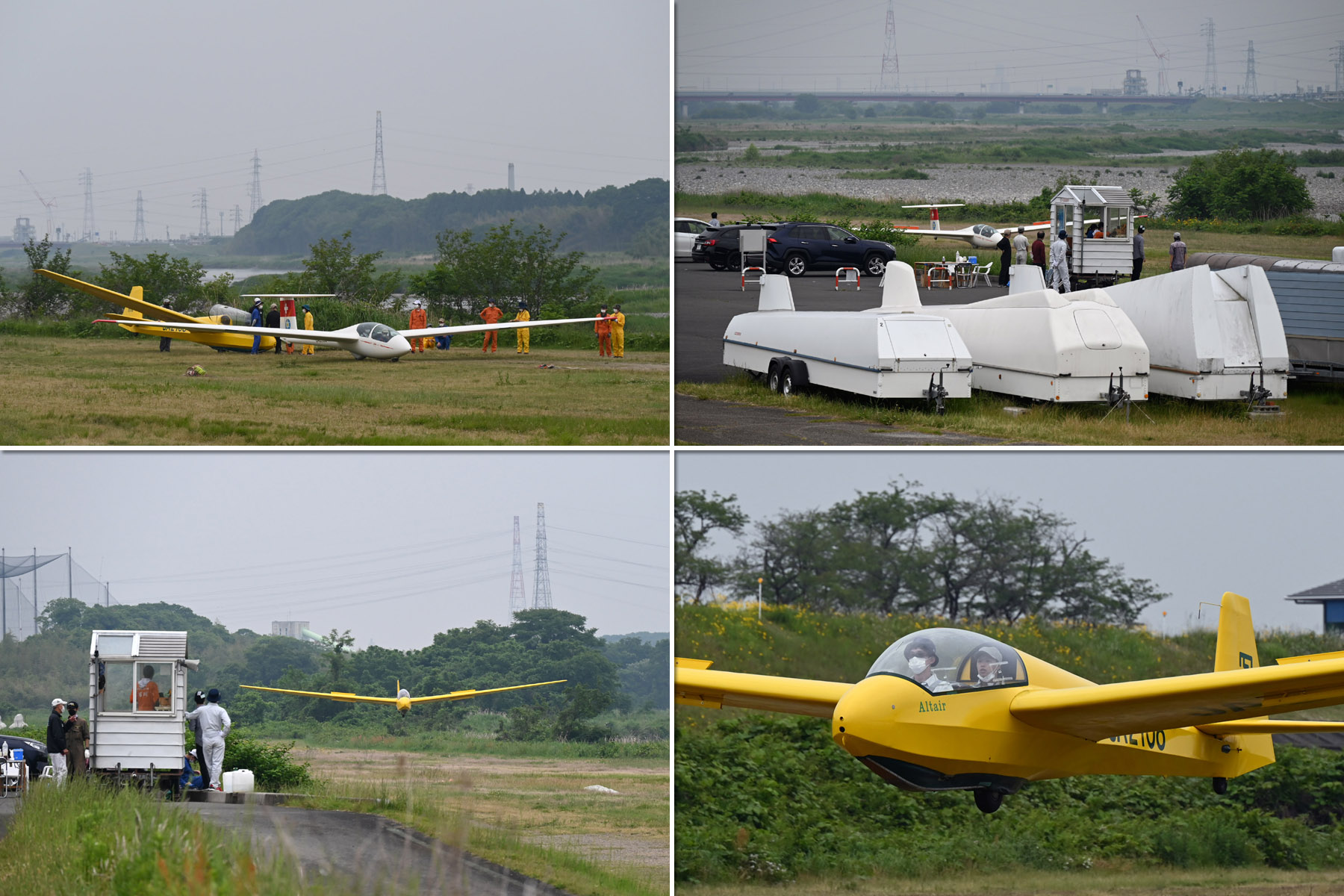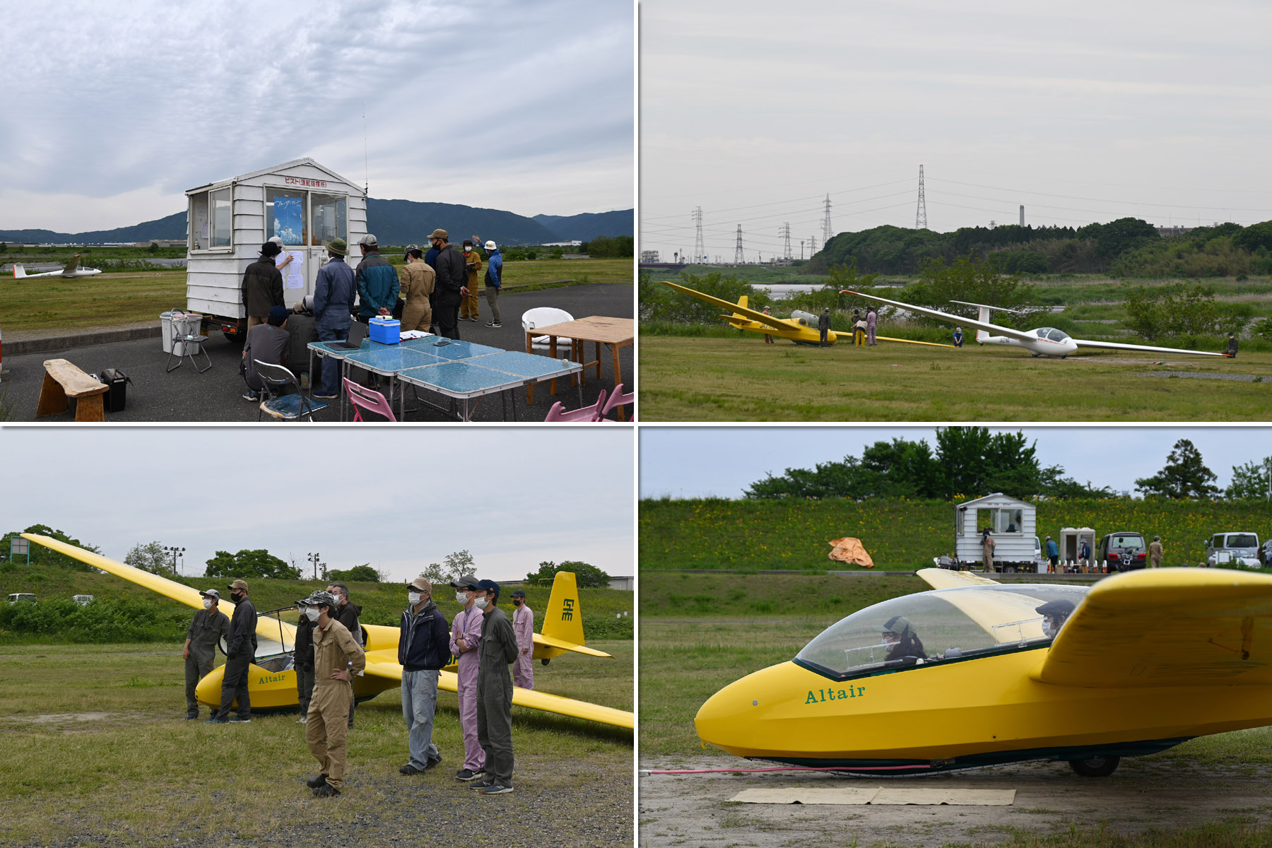 このような状況下でしたので、初合宿の京大 1回生 5名 (黄色のツナギ姿)がいたものの、総発数は 50発になりました。 概ね 1人 2発程度回ったところで、最終着陸 15:48 と少し早めの撤収となりました。