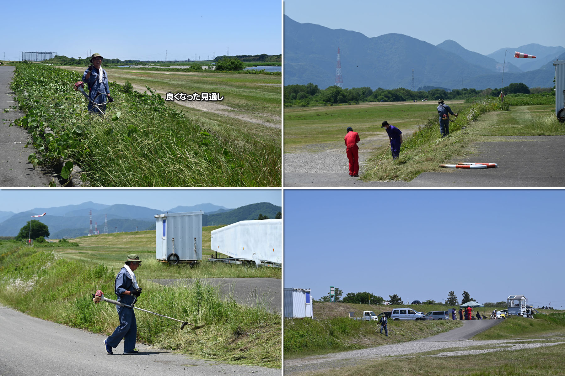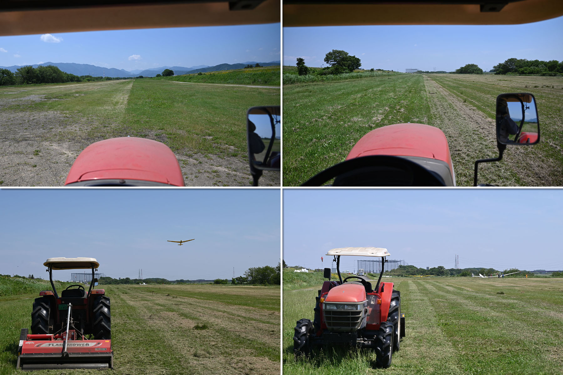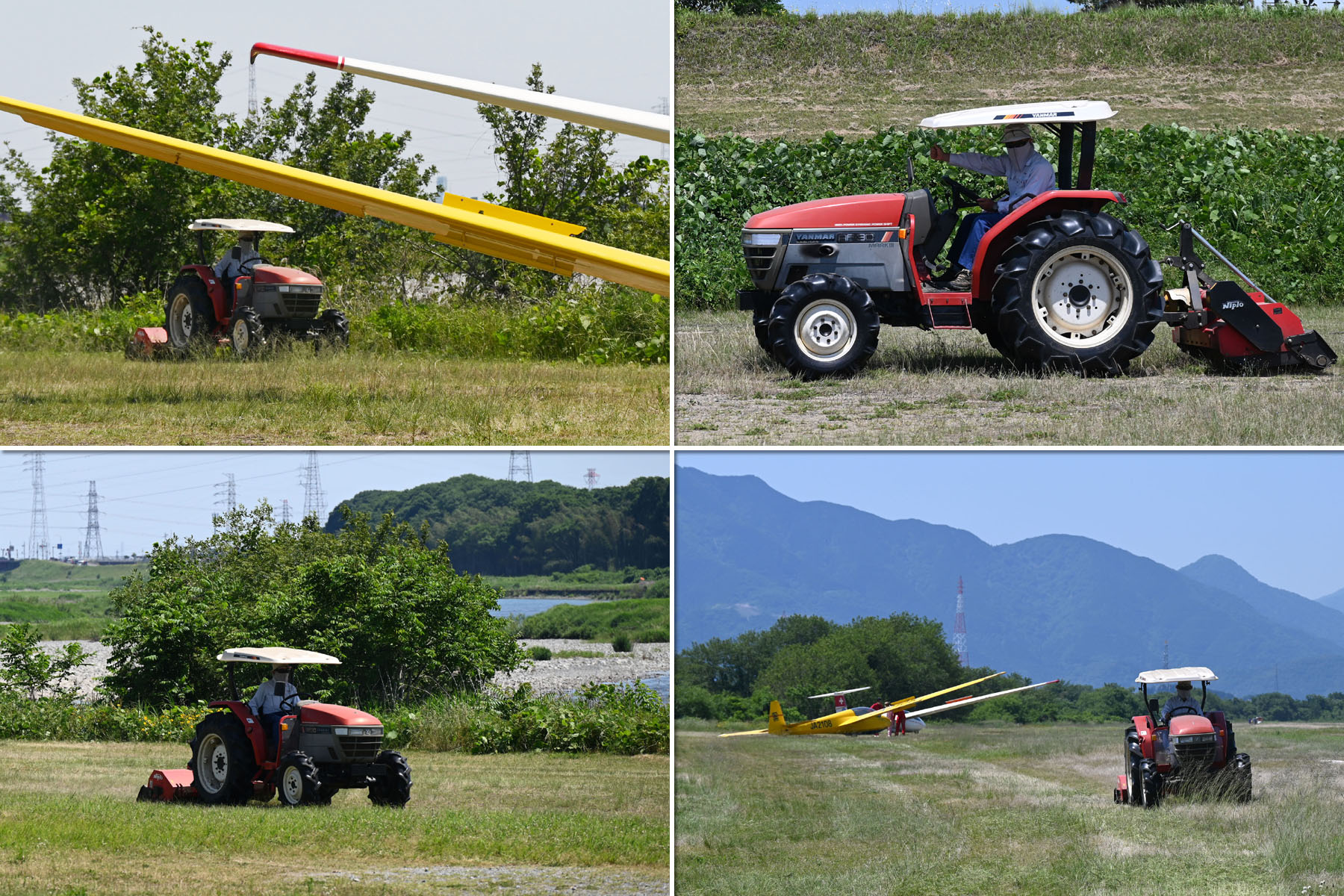 草刈作業は刈り払い機で星野さんがピスト周りの草刈、南からの着陸接地場所への見通しが良くなりました。 長野滑空場で草刈をしている加茂川教官が大野で草刈デビュー、草刈民代トラクターで川下着陸場所を綺麗にして満足げでした。