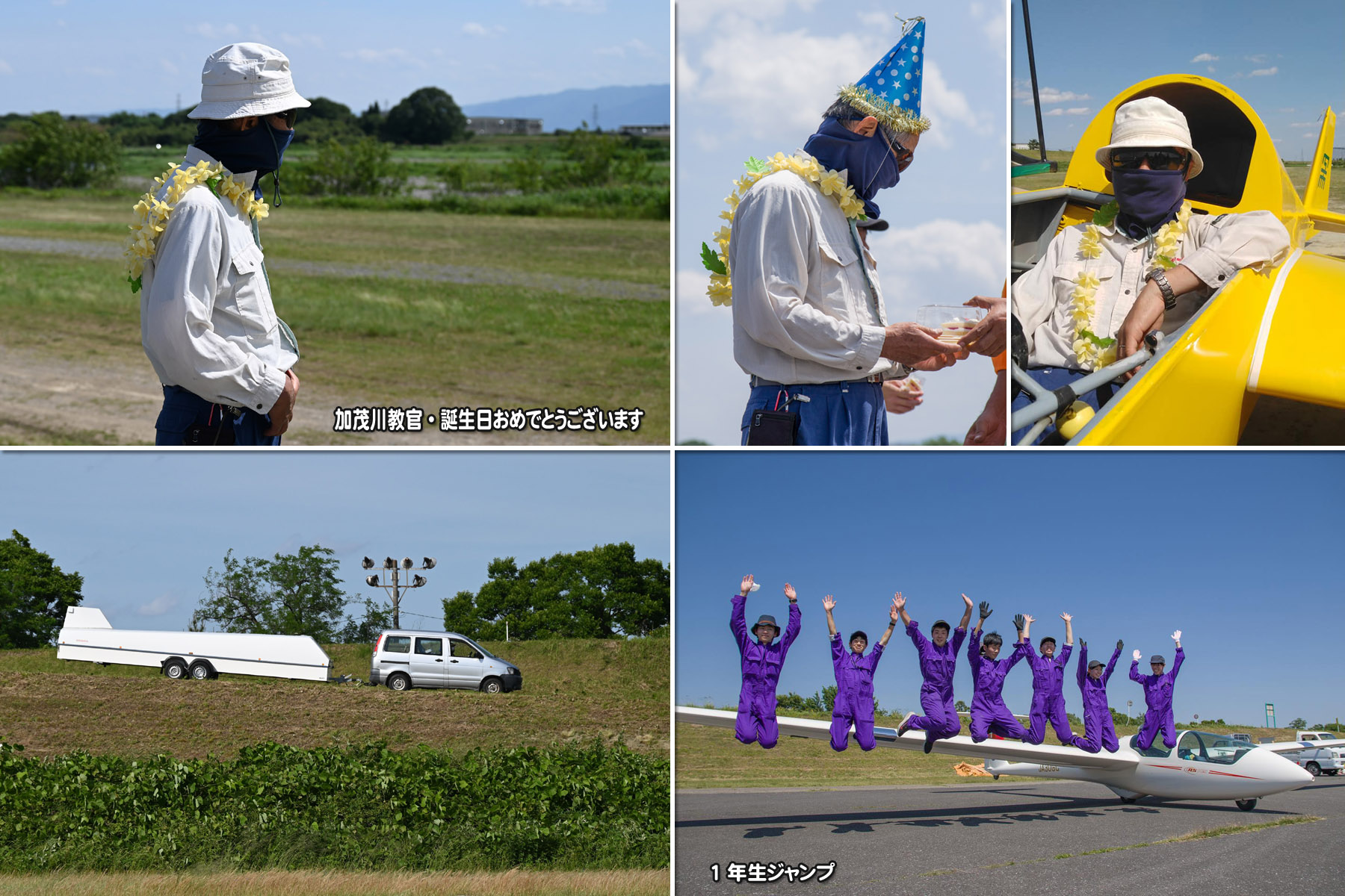 今日は加茂川教官の誕生日で、学生たちからのプレゼント/花の首飾り姿で後席指導していました。 また、辻村草刈隊長は草刈正雄のメンテを涼しい朝の内に行っていました。 本日の総発航回数 48回、その内、学生の体験搭乗 8名、教官知人 1名で、最終着陸は 16:53 でした。