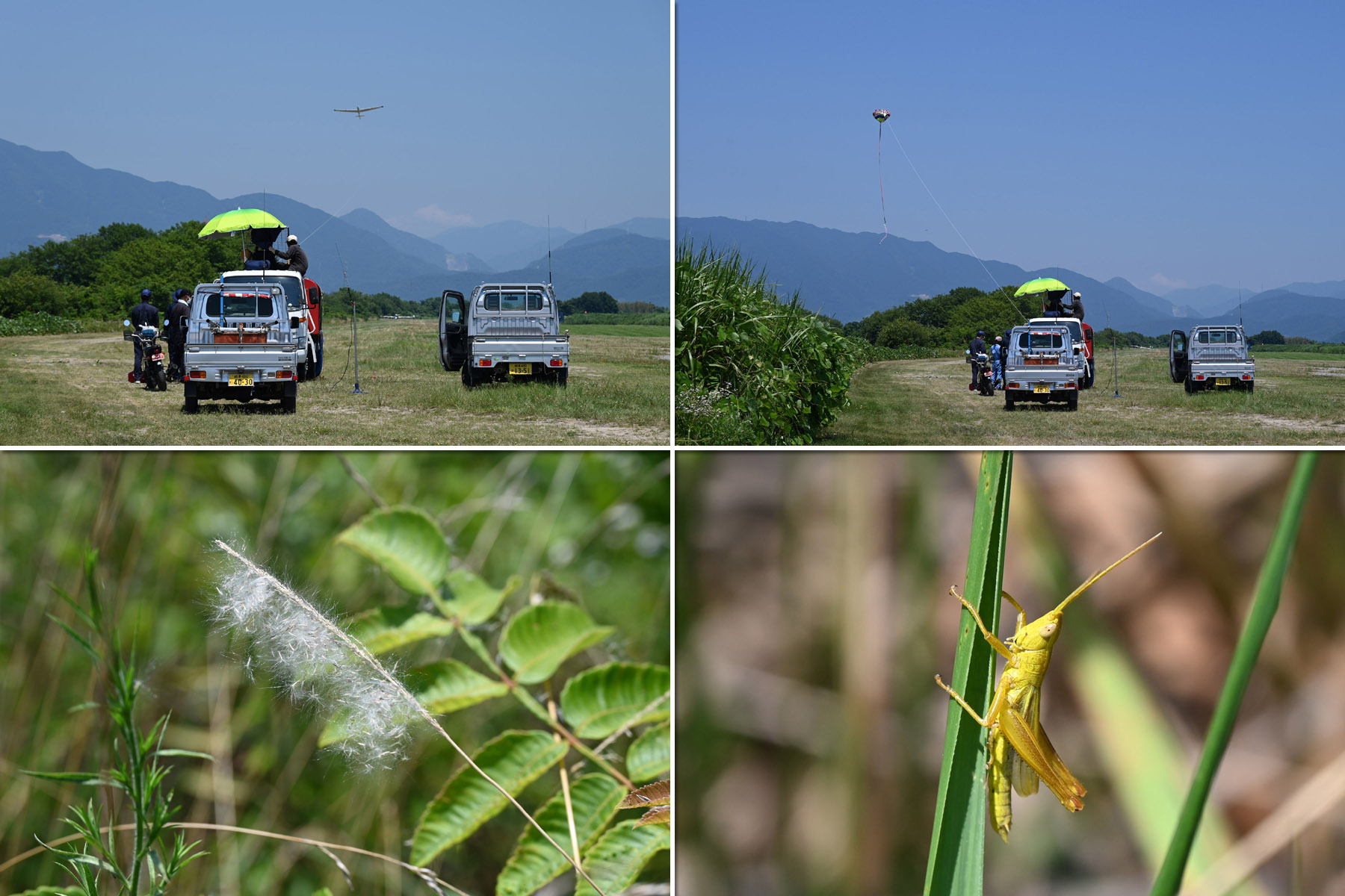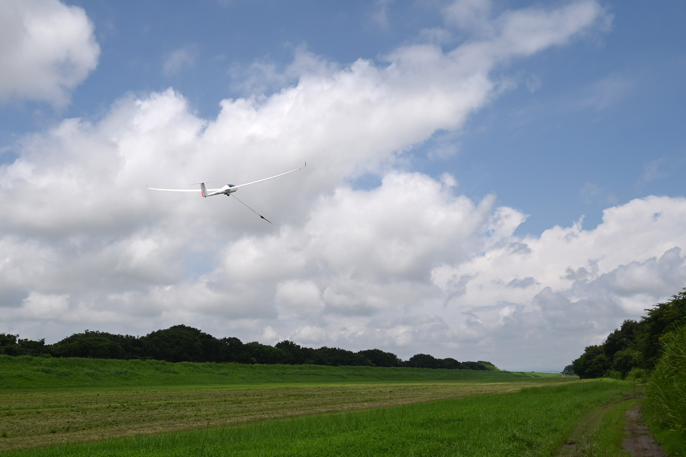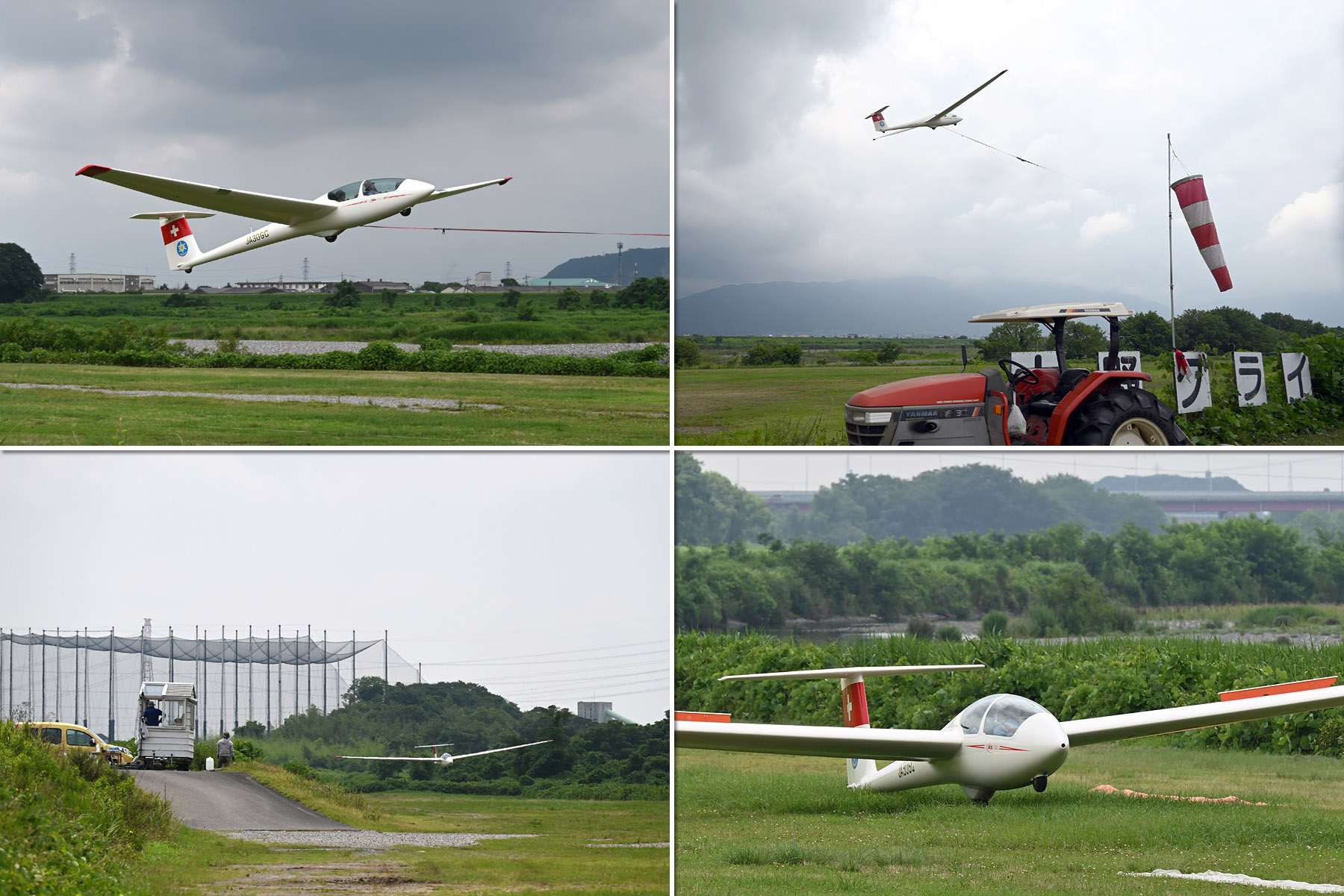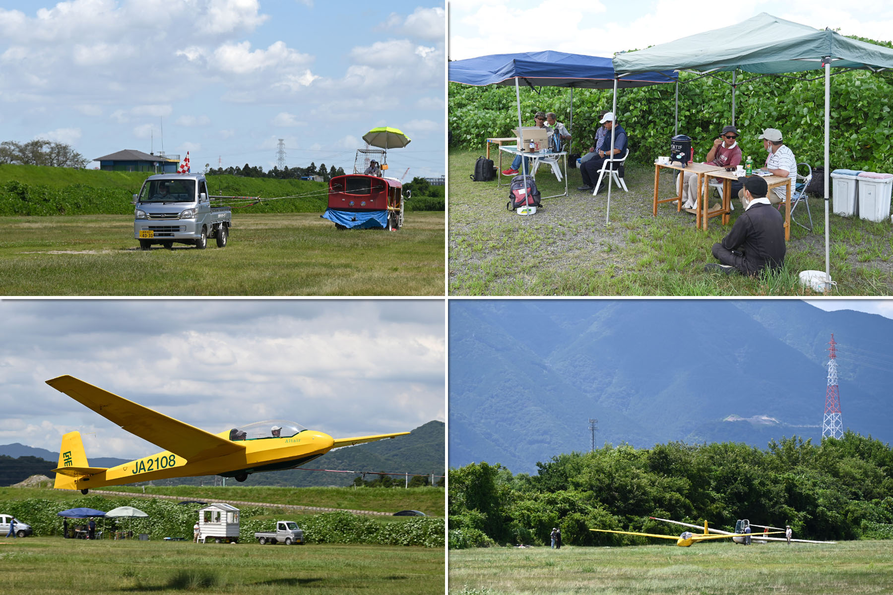 同志社との合同運航 2日目、JA30GC、JA2108 の 2機を組み立てて、8:44 に川下ピストで 1発目を発航。 風が弱く、更にサッカー場利用のため W/T を川下寄りに設置したこともあり、索長 800m 離脱高度は 300m 程度で、バッタ飛びの連続でした。