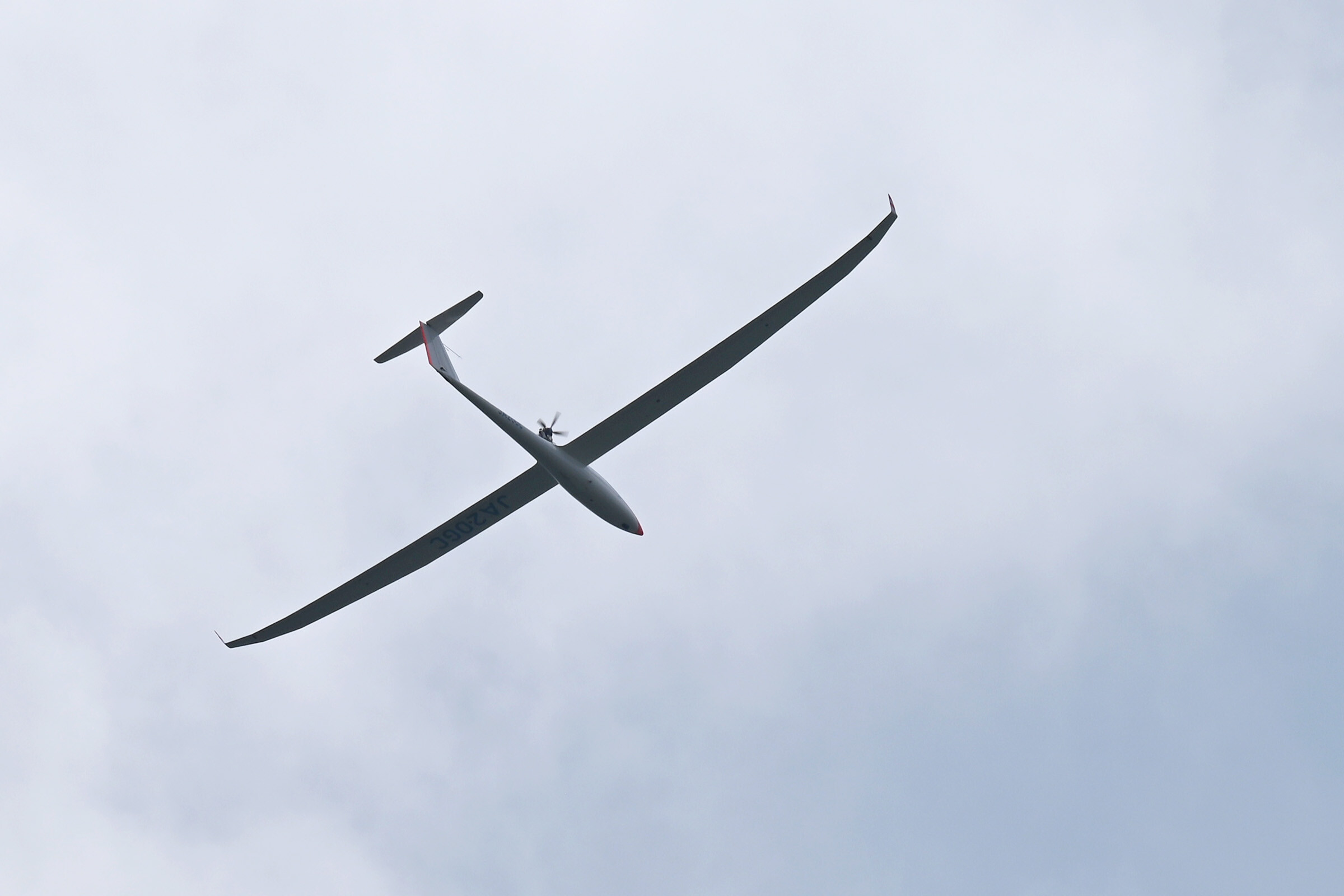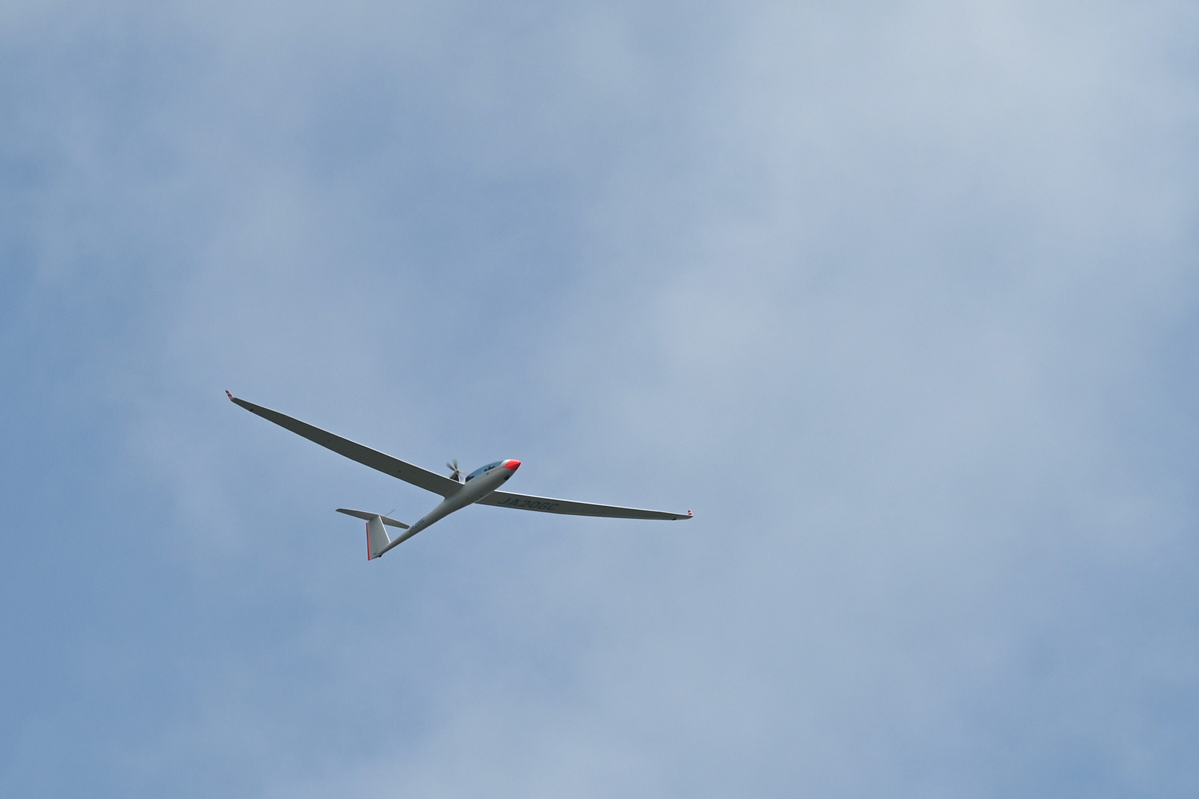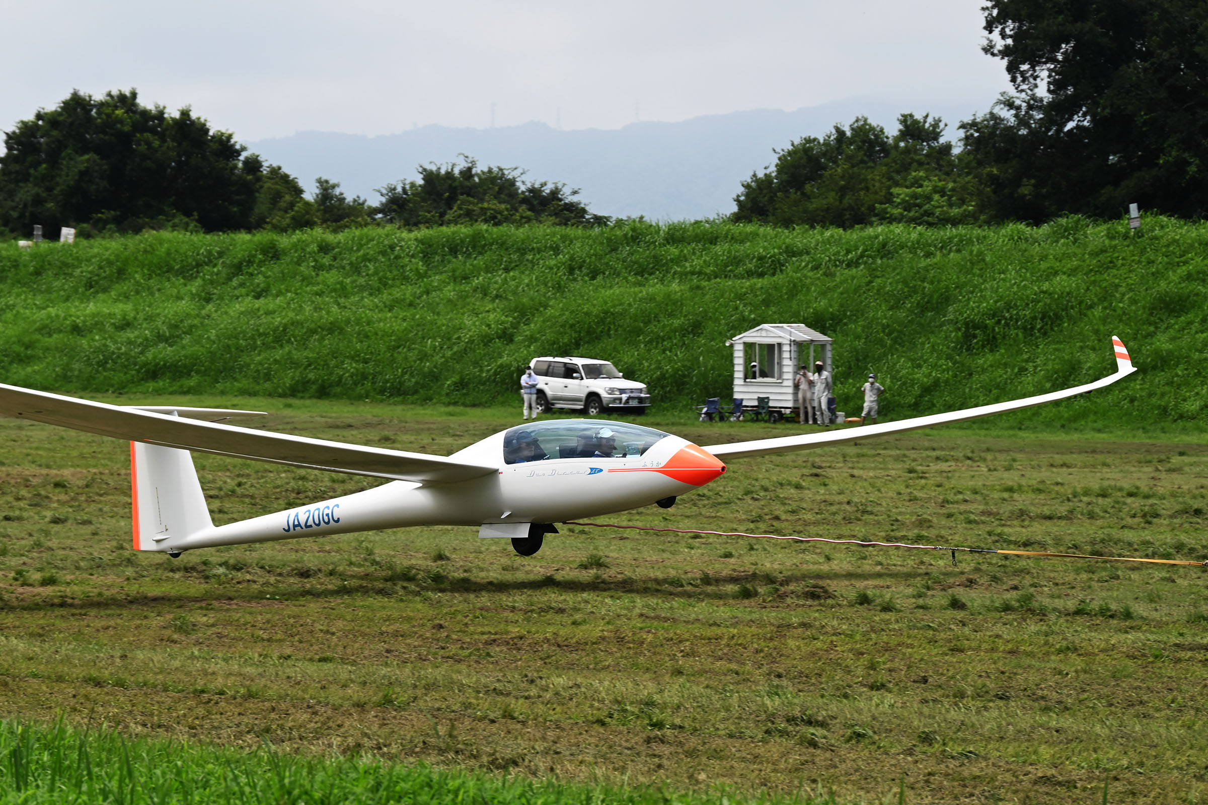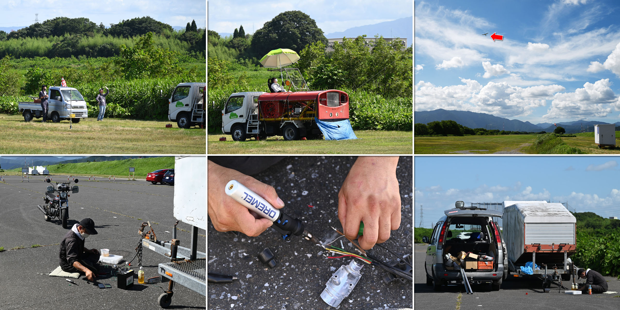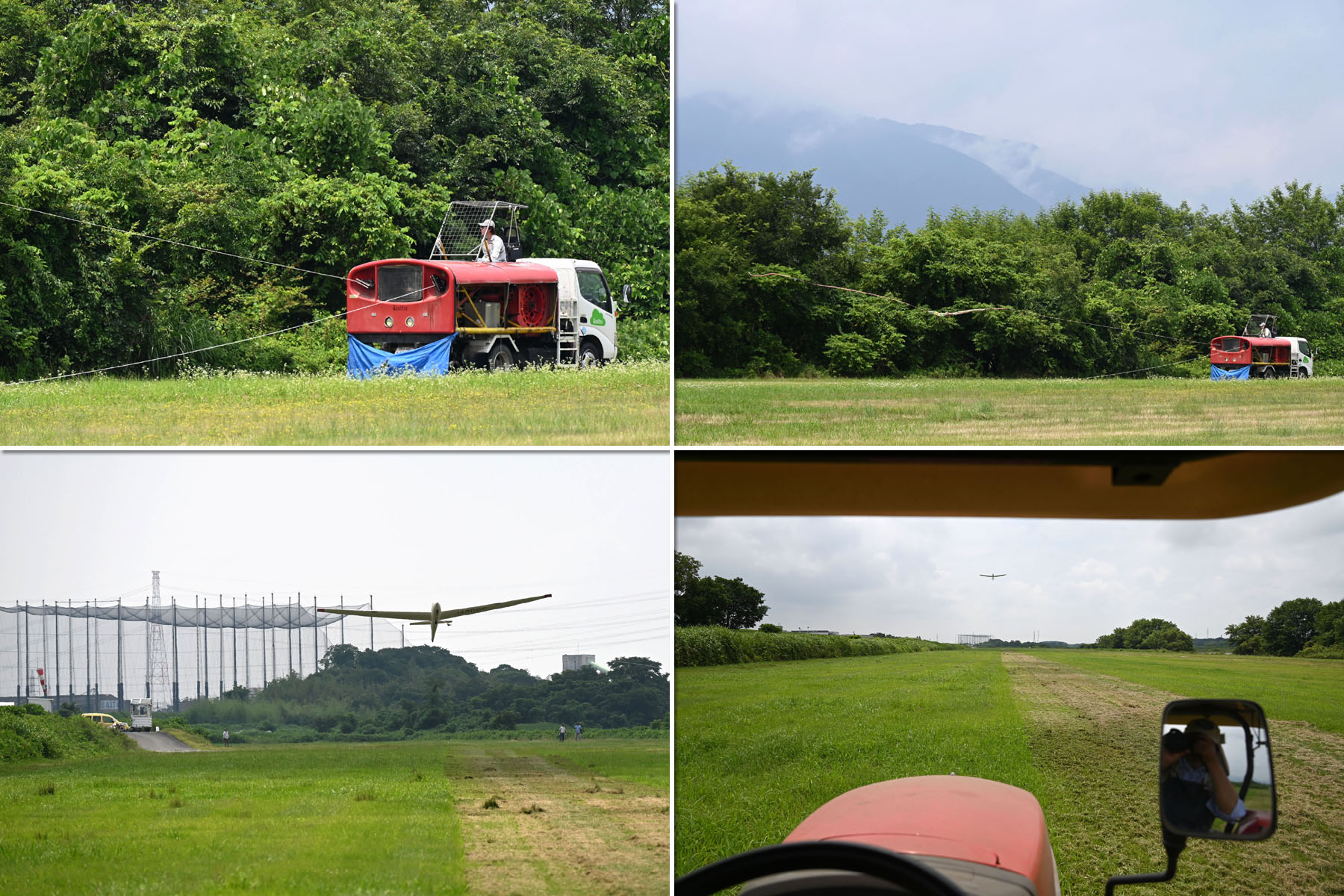 同志社との合同運航 2日目、JA30GC、JA2108 の 2機を組み立てて、8:44 に川下ピストで 1発目を発航。 風が弱く、更にサッカー場利用のため W/T を川下寄りに設置したこともあり、索長 800m 離脱高度は 300m 程度で、バッタ飛びの連続でした。