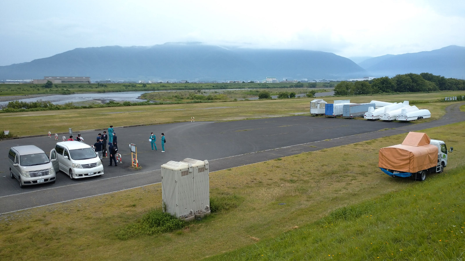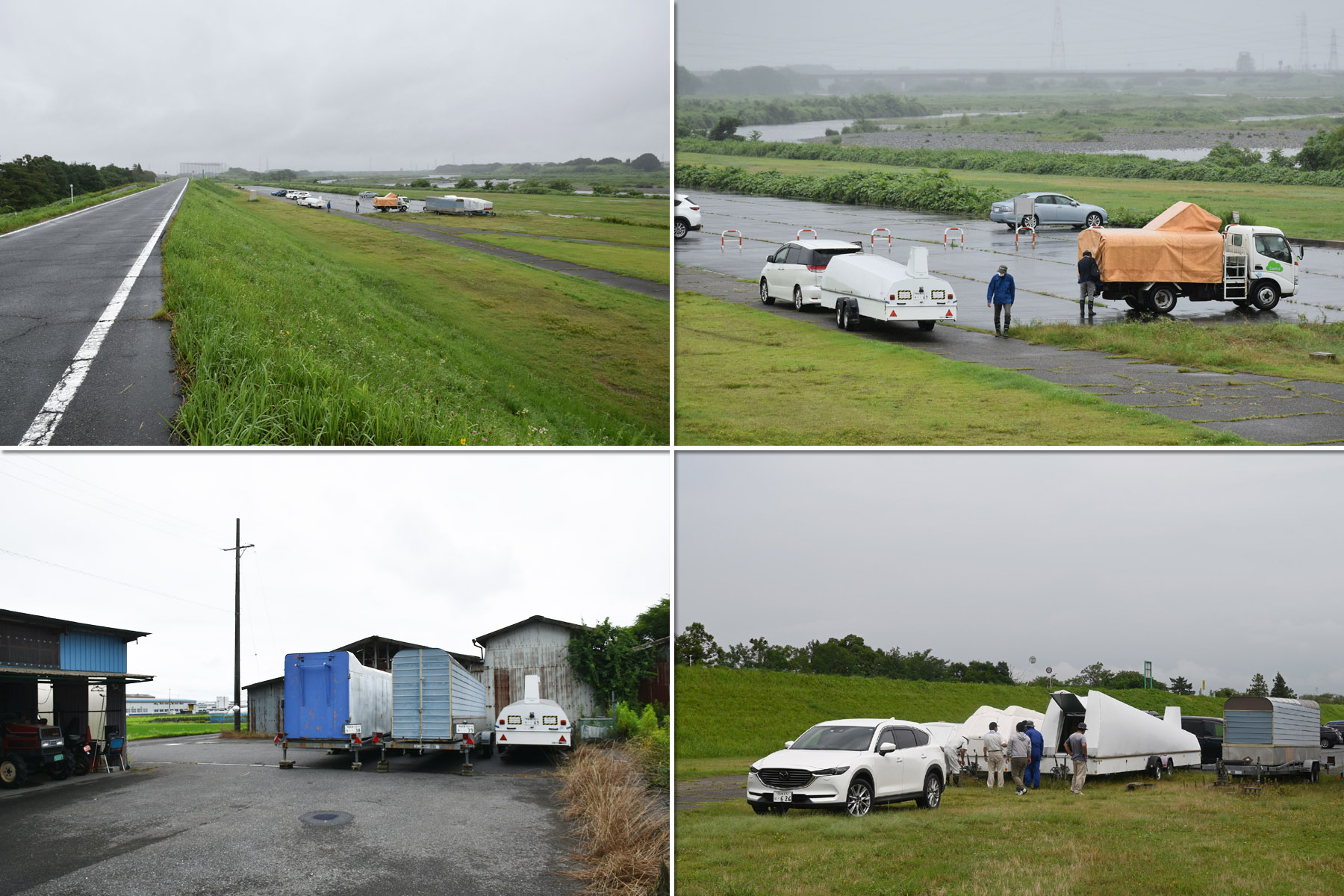 お昼 12時まで、新人さんを中心にフライト、トップは佐々木+岸教官の 13分、あとはおおむねバッタ。 8 発目が飛行中に雲行き悪くなり撤収、機体をトレーラーに入れたら豪雨と雷鳴、各自車内に避難して昼食。