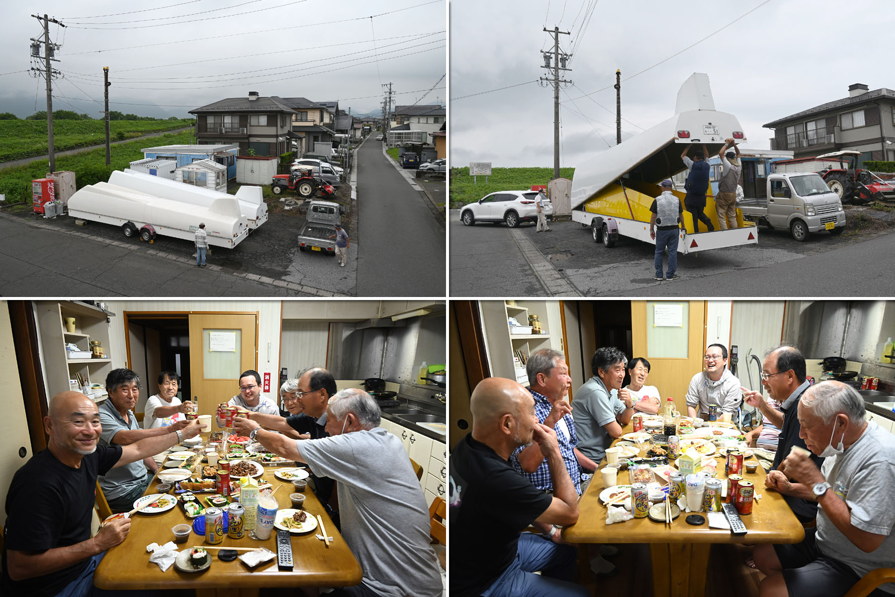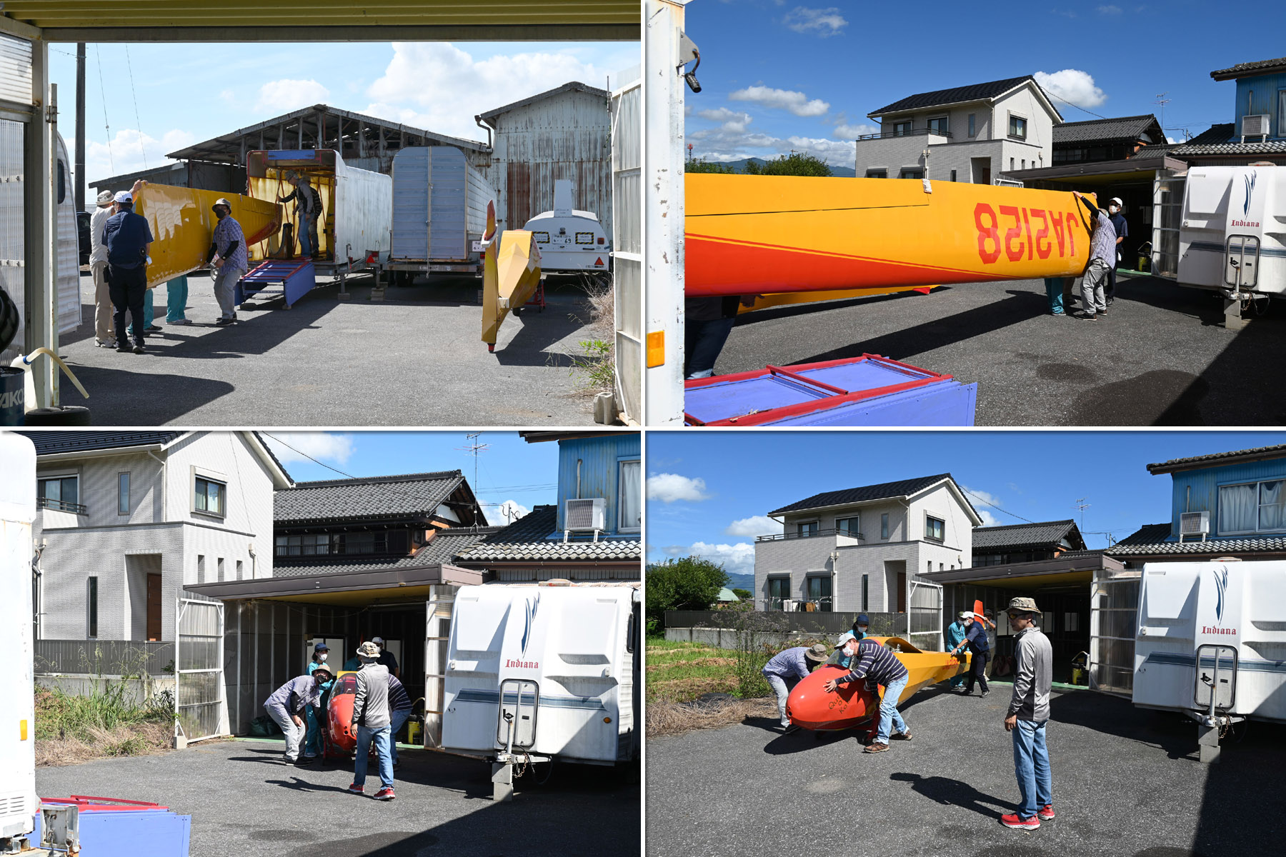 一方 OGCメンバーと学生 2名は、八木宿舎で JA2128 トレーラーの車検準備で機体をファクトリーに格納しました。 トレーラーを整備のために滑空場に運ぶ段になって、アシナガ蜂が牽引部分のアーム空洞内からわらわら出てきて、それを山本さんが殺虫剤で必死に駆除しました。