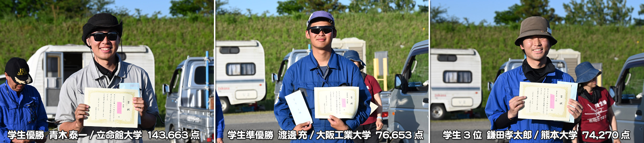 練習日から 5日まで天候に恵まれ、参加選手 35名のうち 23名が記録を残すなかなかの大会でした。5/6 の天候が危ぶまれたため、5/5 のうちに競技終了と表彰式の繰り上げ開催を決定しました。入賞された皆さん、おめでとうございます。