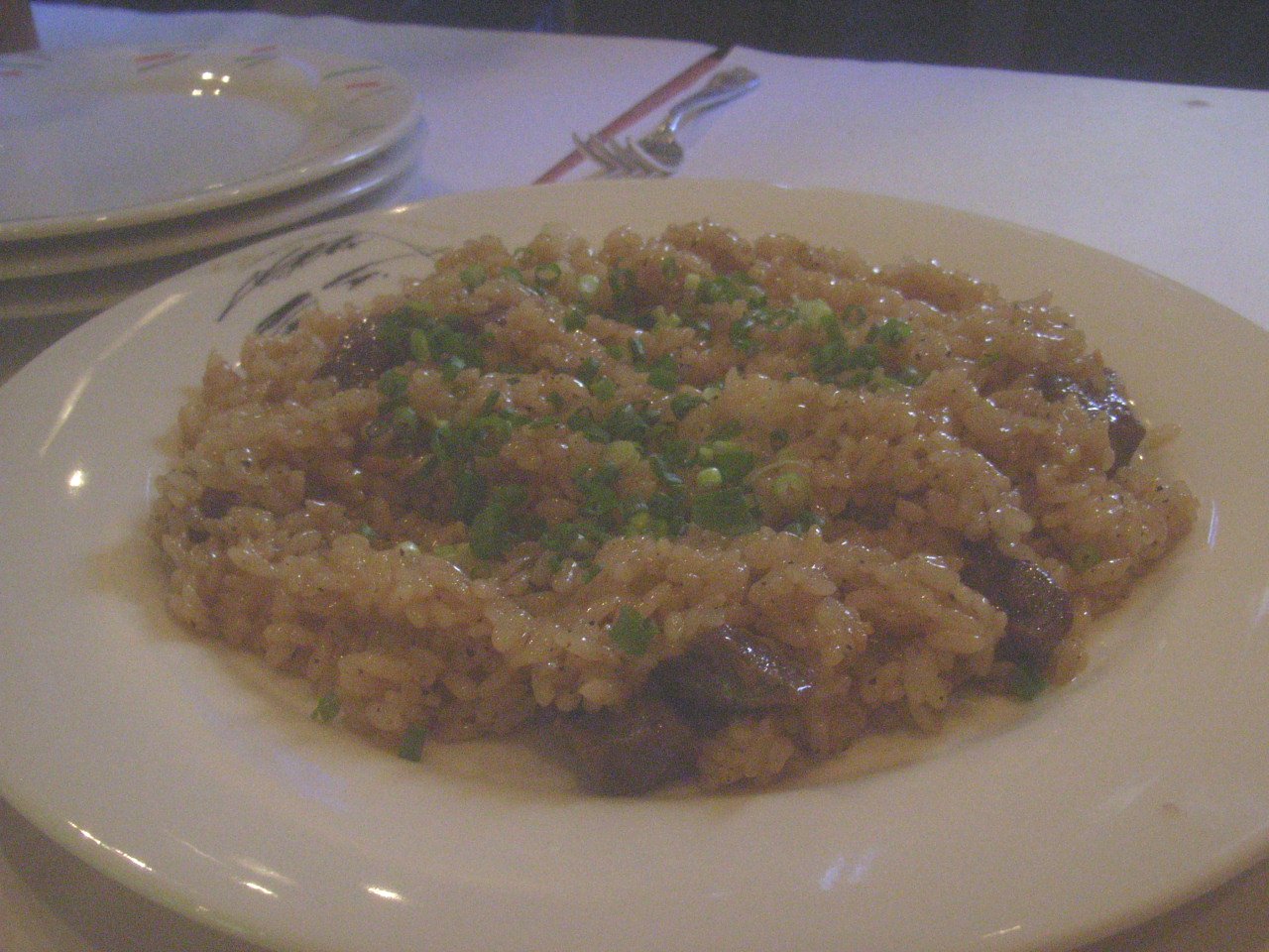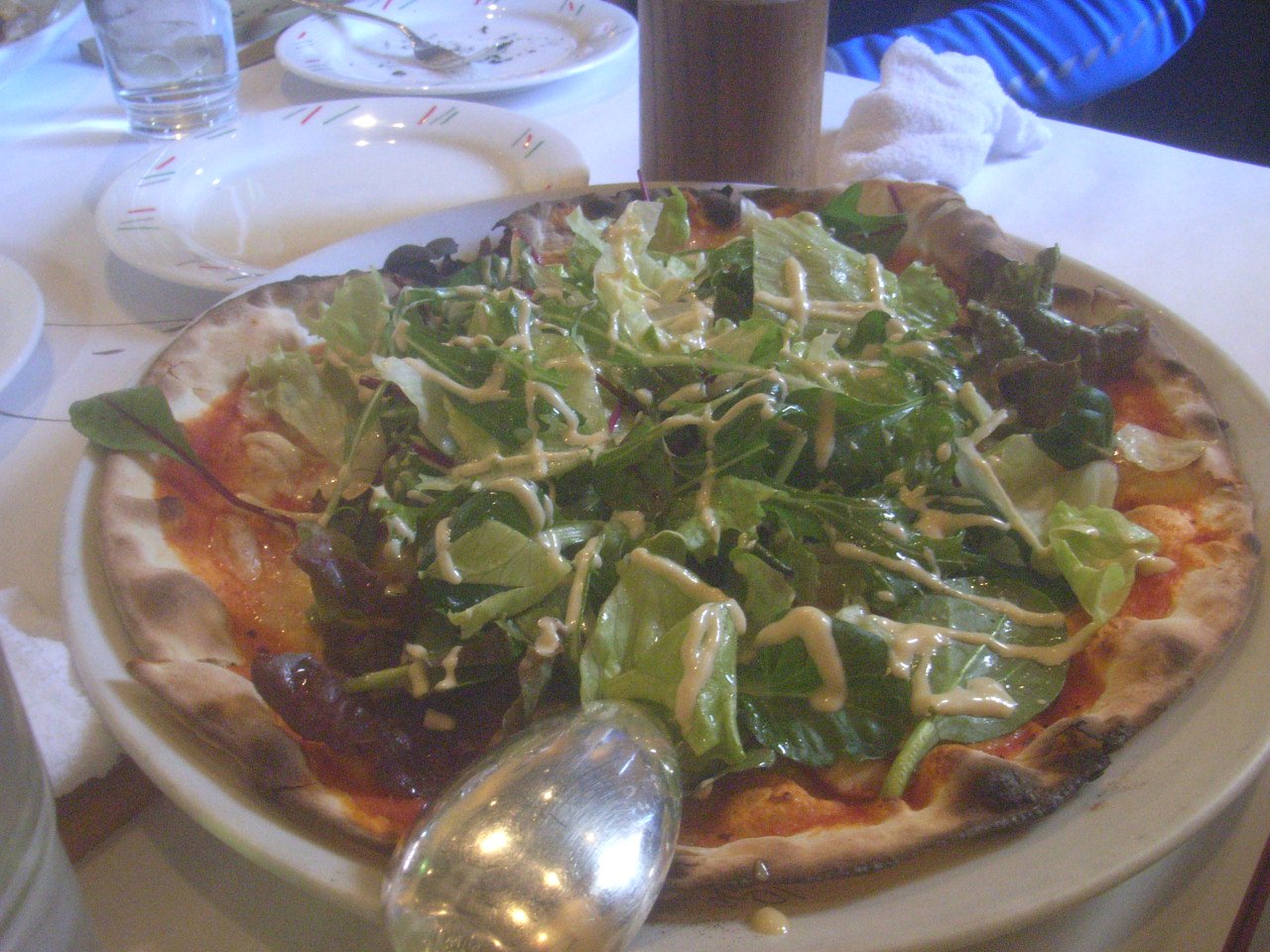 そして店員さんお薦めの「儀太郎シャモのもろみ燻製のサラダピッツア」。すごくクリスピーなピザ生地の上に儀太郎シャモのもろみ燻製が敷かれ、その上にまるでサラダのように生野菜がどっさり。そして、コメ・スタライス。たぶん醤油とガーリックで味付けをしてあるのでしょうか?かなり美味しい料理でした。割り勘にして、一人1500円ちょっとでした。