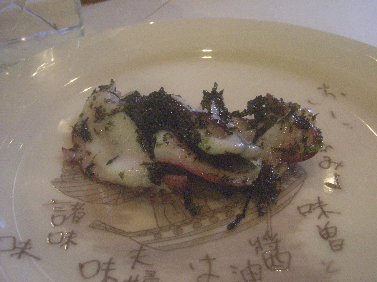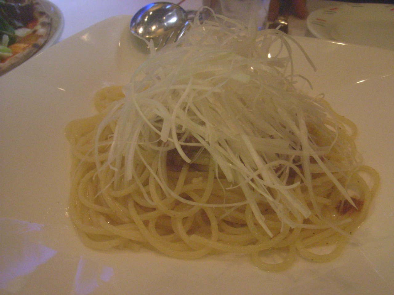 今日は6名もいるので、何種類か注文してシェアして食べることに。まずは、タコのカルパッチョ。薄くスライスしたタコの上に熱々のオリーブオイルを掛け、岩海苔と混ぜて食べます。岩海苔の風味が堪りません。そしてこの店の名物パスタの「野田市のパスタ」。一見するとミートソースなのですが、醤油もろみで煮込んだ挽き肉と白髪ネギが良いアクセントになっています。
