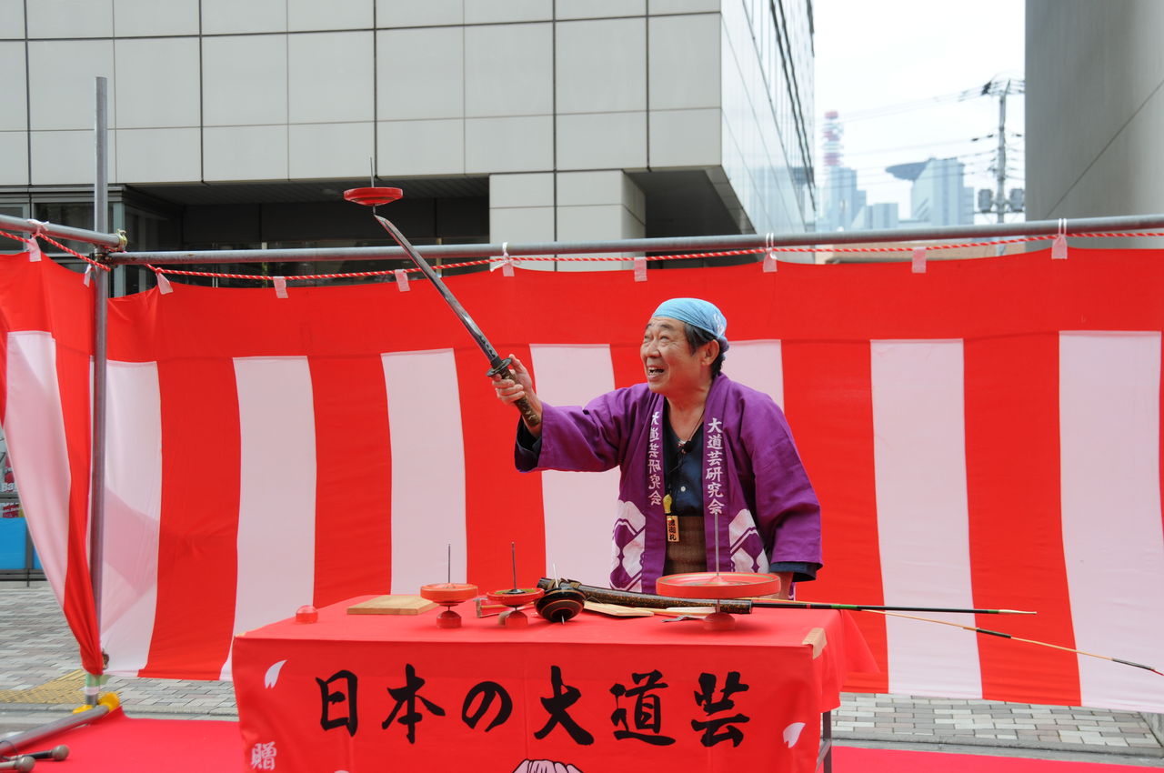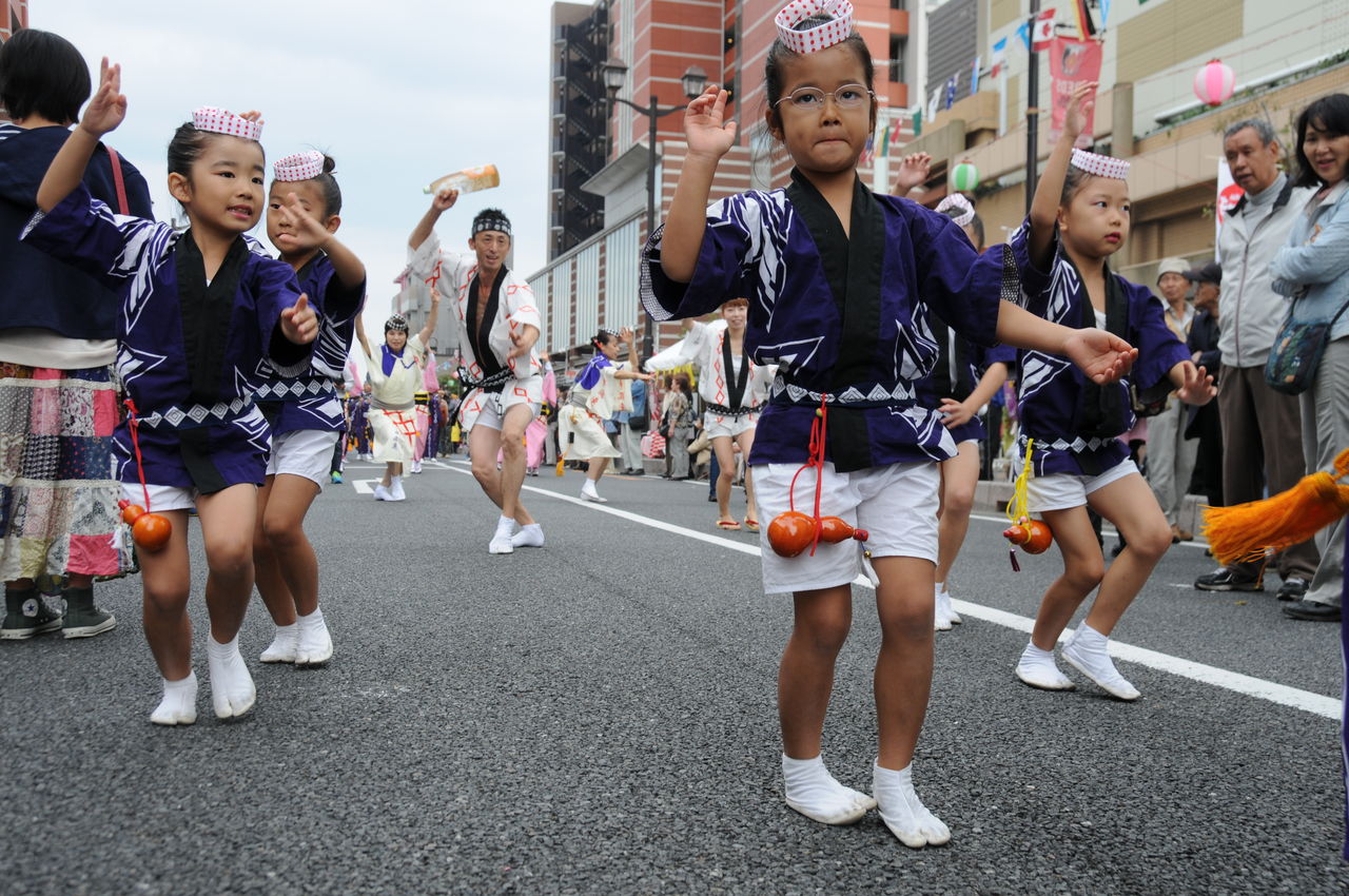 ちびっこを含めた阿波踊りがそばを通ると大道芸の方は集中力が途切れミス多発