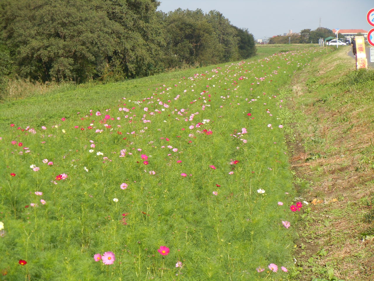 武蔵水路との合流地点を過ぎ少し行くと土手の脇にコスモスが