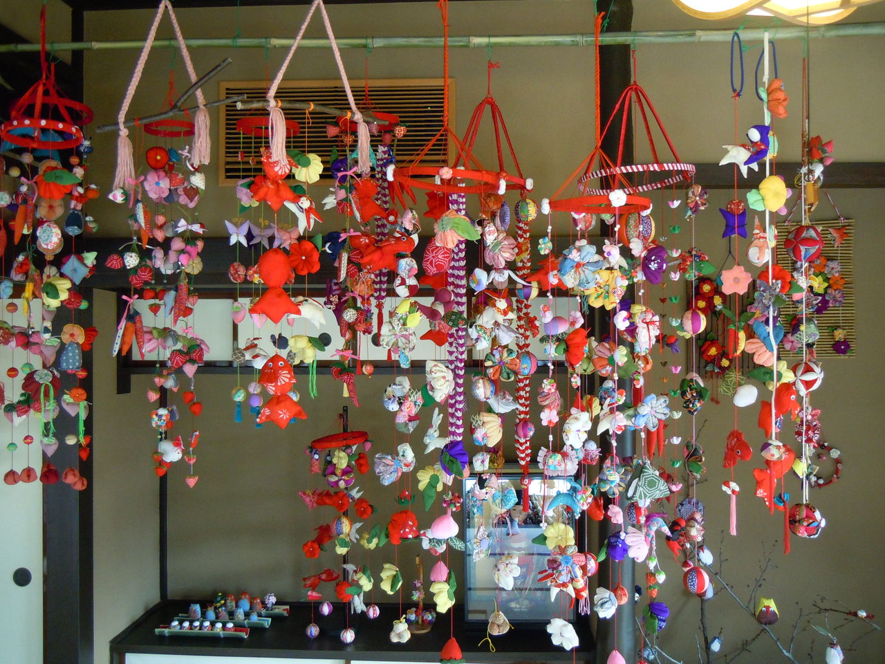 奥の茶室では吊るし雛が