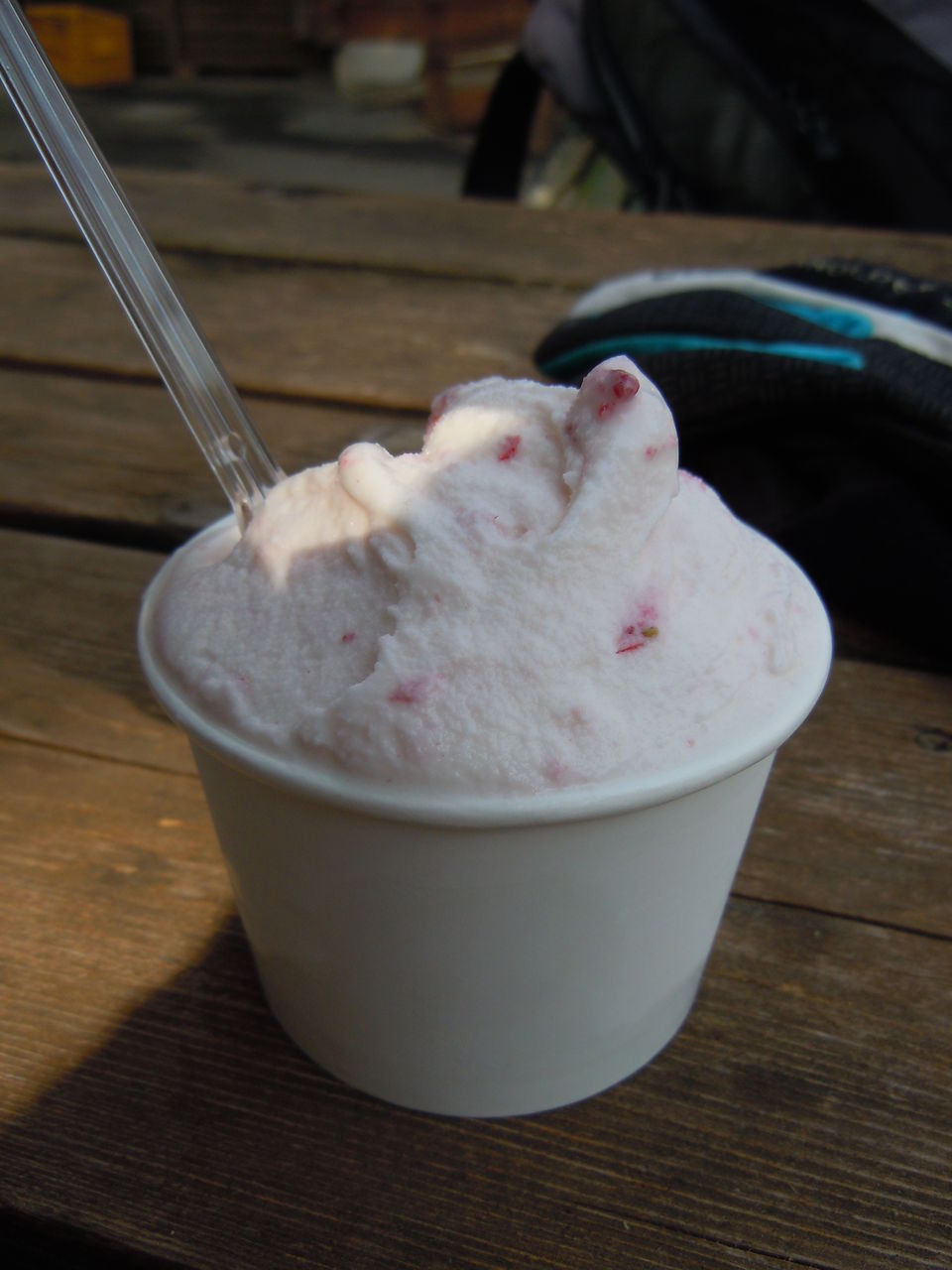 いつもは定番のミルクを購入するのだが、今回は期間限定でおまけに数量限定のつぶつぶイチゴアイスを購入、とても美味しかった