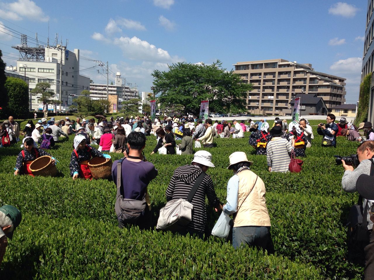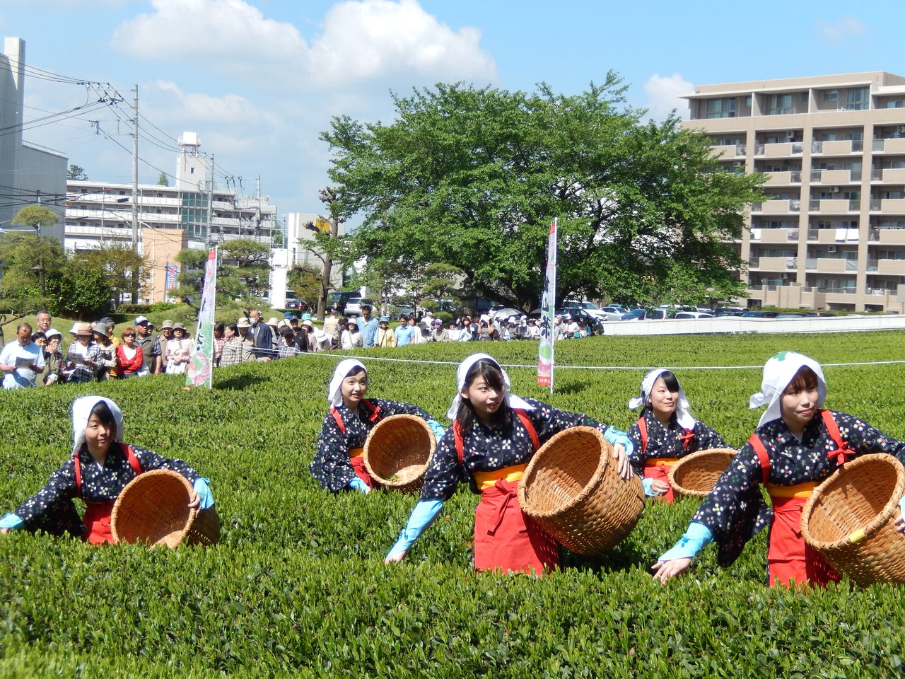 祭りは関係者のあいさつの後茶娘たちが市役所前の茶畑で茶摘みを実施